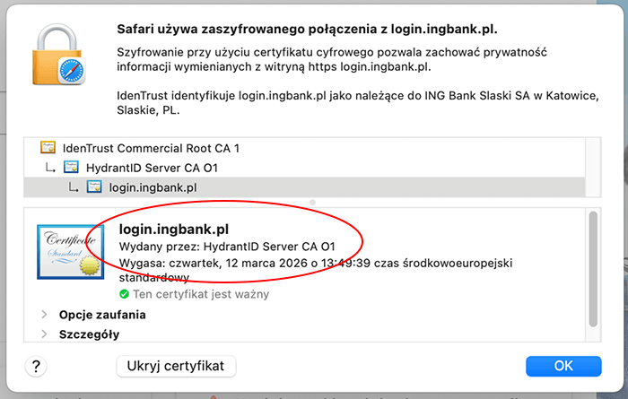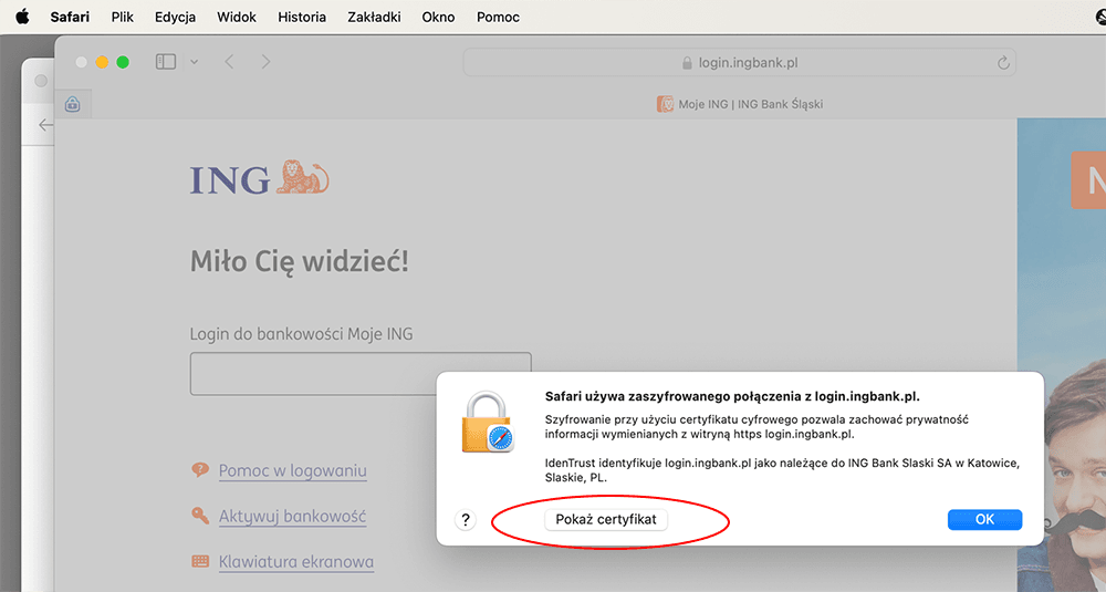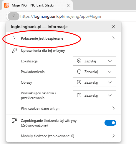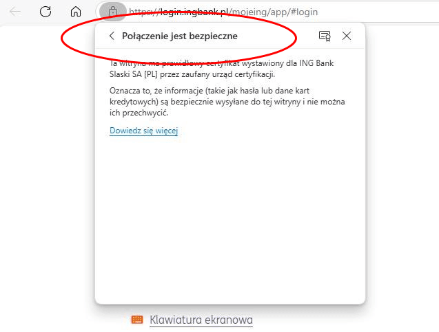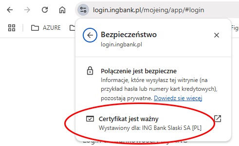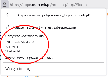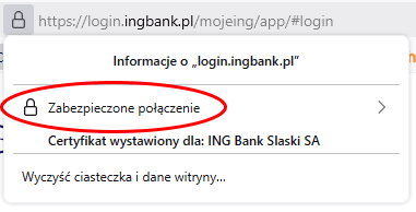 W przypadku logowania się do naszej bankowości, strona powinna mieć certyfikat wydany dla ING Banku Śląskiego S.A.