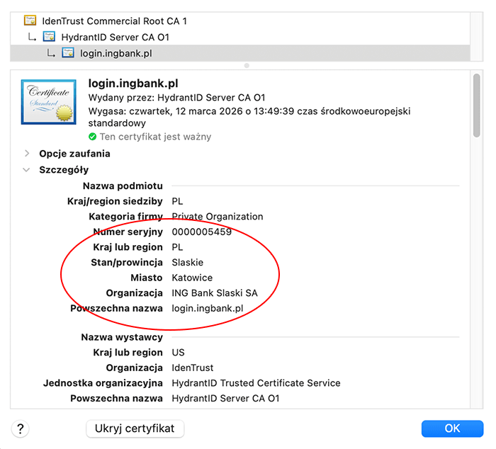 Po rozwinięciu będziesz już mógł zobaczyć organizację, dla której wystawiono certyfikat.