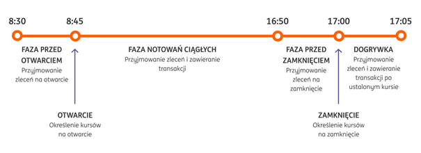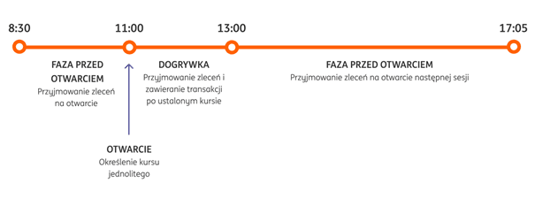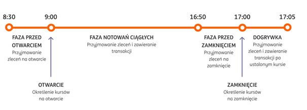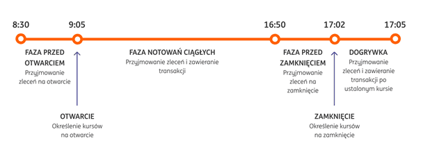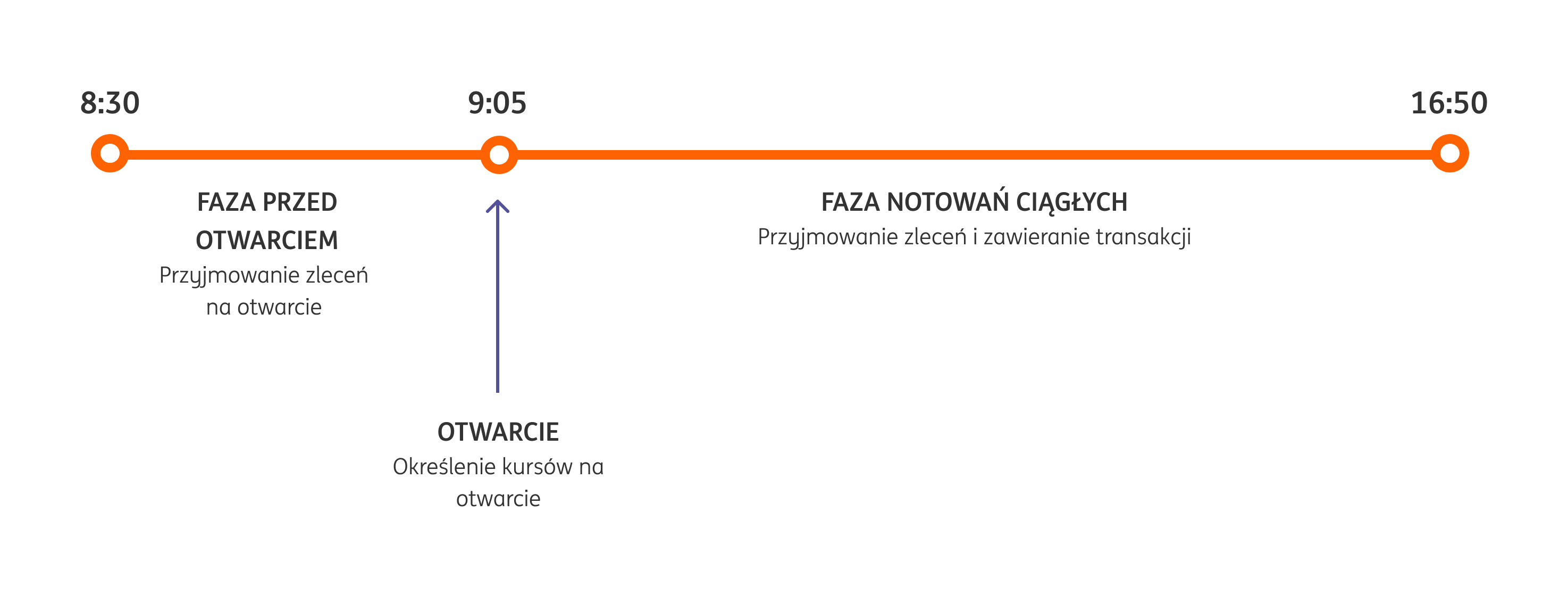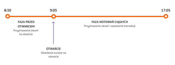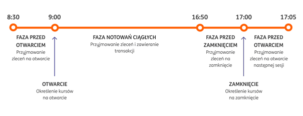 System notowań składa się z kilku części, które nazywamy fazami sesji. Giełda dokładnie określa, co w poszczególnych fazach sesji się dzieje i jaki jest czas ich trwania. System giełdowy jest dostępny w dni sesyjne w godzinach 8:30 – 17:05. To oznacza, że w tym czasie zlecenia, modyfikacje i anulaty, które składasz, są przekazywane natychmiast do systemu giełdowego. Poza tymi godzinami również możesz składać zlecenia, modyfikować je i anulować. Biuro Maklerskie przekaże te dyspozycje na giełdę tylko w godzinach pracy systemu giełdowego. Poza tymi godzinami również możesz składać dyspozycje, ale przekażemy je na giełdę tylko w godzinach pracy systemu giełdowego.