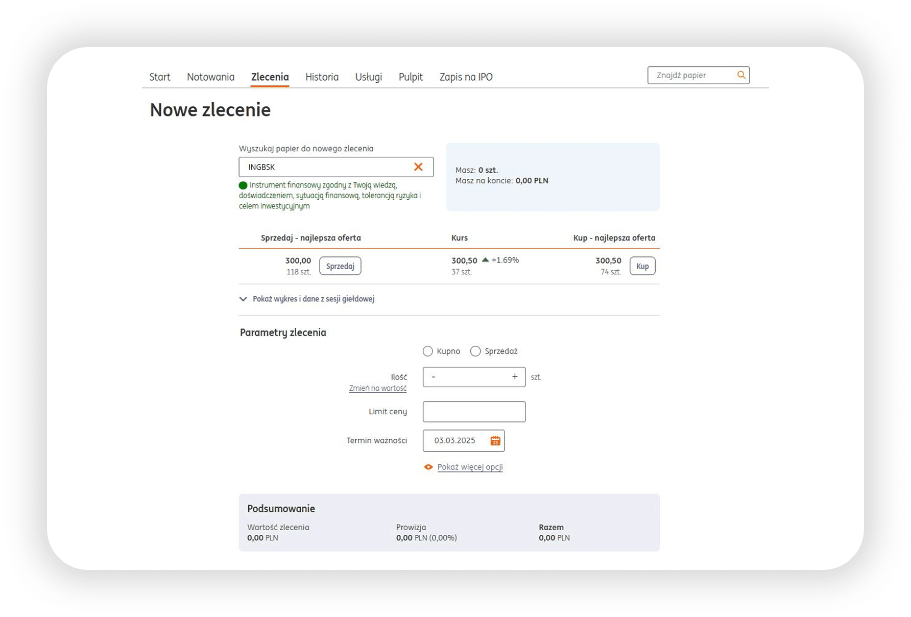 - Pod nazwą papieru jest informacja czy dany instrument jest zgodny z Twoim profilem inwestycyjnym. Ta informacja nie ogranicza możliwości złożenia zlecenia.
