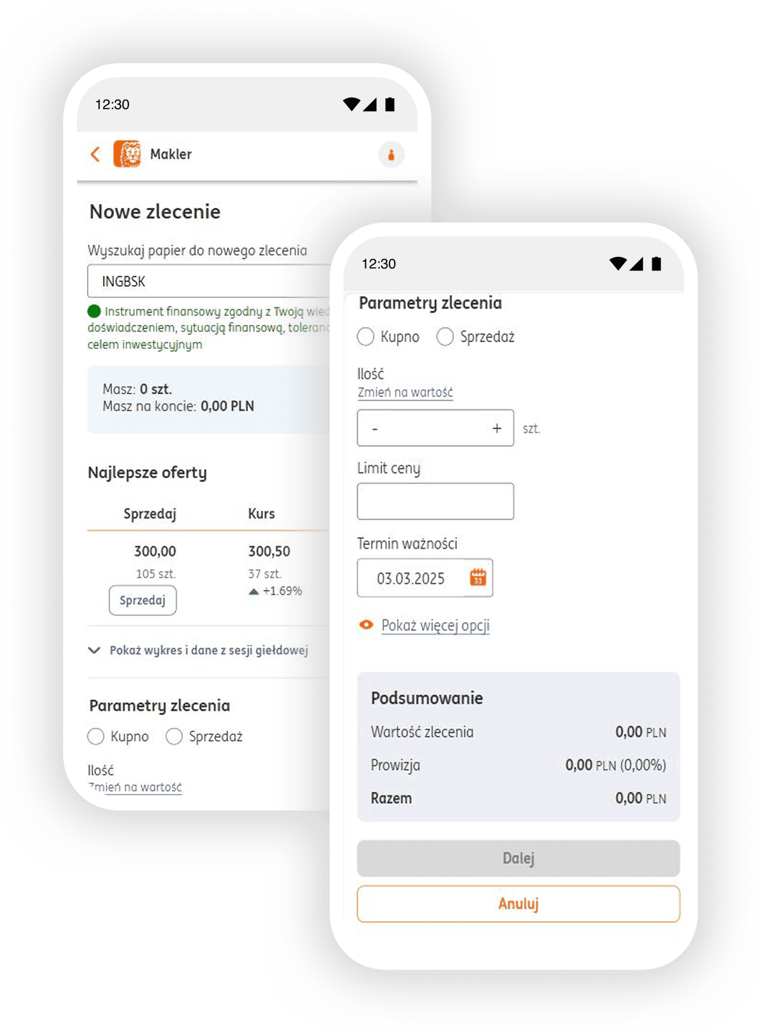 - Do formatki zlecenia możesz też przejść z ekranu startowego, klikając Nowe zlecenie lub z Notowań, klikając w ofertę kupna lub sprzedaży.