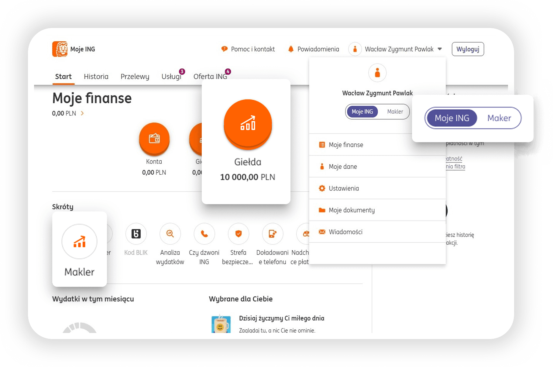 - Kliknij w skrót Makler. Możesz ustawić go samodzielnie w Moim ING. Wystarczy, że klikniesz w ikonę ołówka w prawym górnym rogu sekcji Skróty i dodasz Maklera.