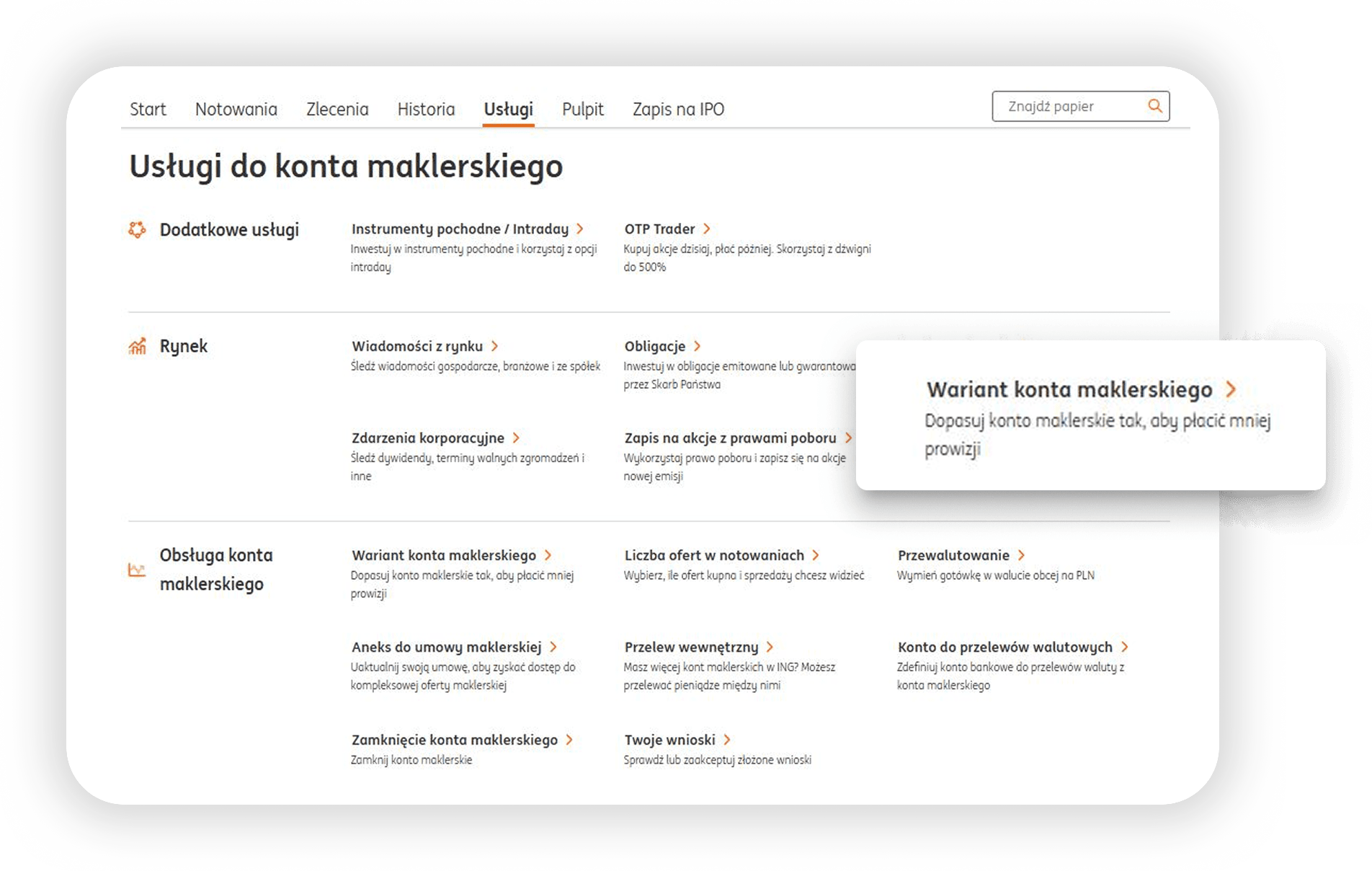 Wariant konta maklerskiego zmienisz w zakładce Usługi – Wariant konta maklerskiego