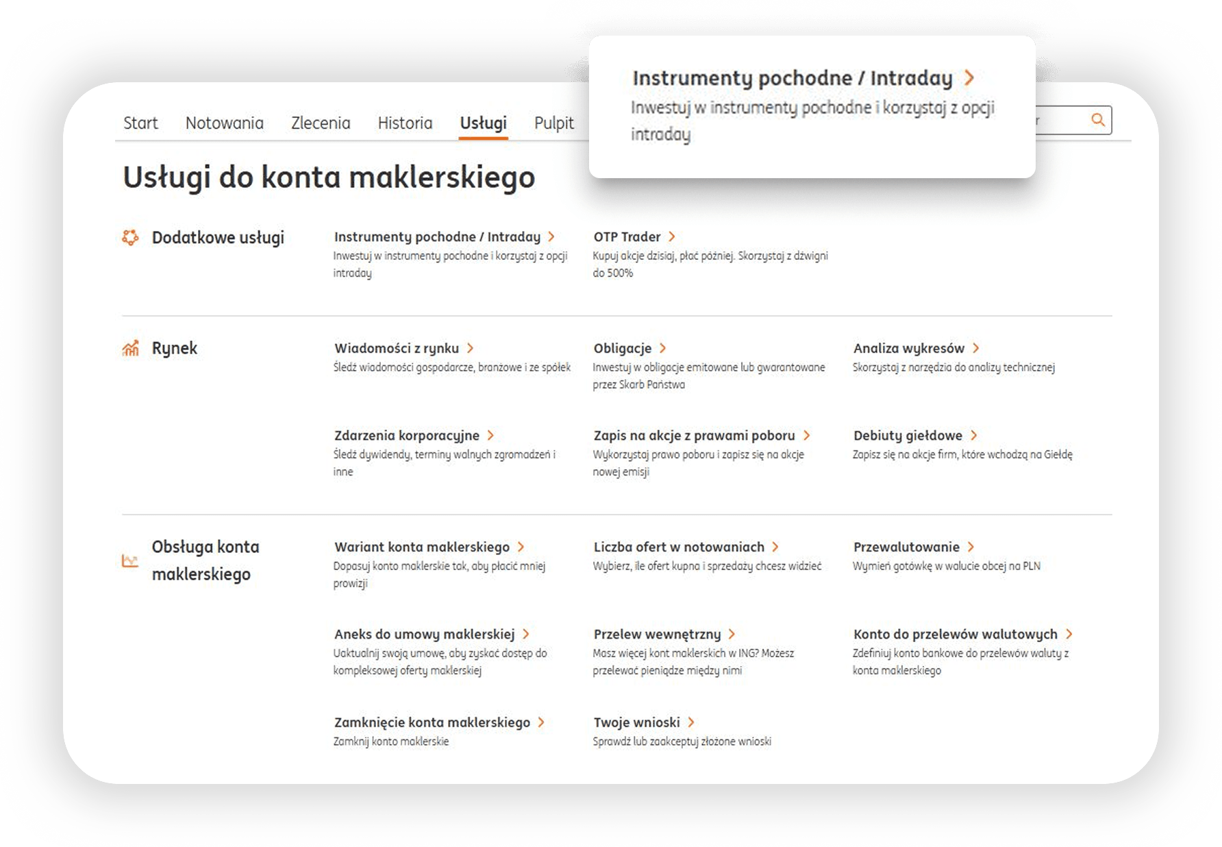 Aby inwestować w instrumenty pochodne, musisz podpisać aneks. Wniosek znajdziesz w zakładce Usługi – Dodatkowe usługi