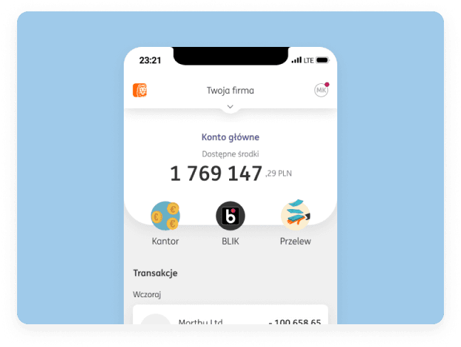 Szybkie płatności mobilne w internecie, terminalach, wpłaty i wypłaty w bankomatach. Płacisz podając 6-cyfrowy jednorazowy kod BLIK i zatwierdzasz PINem w aplikacji mobilnej ING Business. A w zapamiętanych sklepach i przeglądarkach – nawet bez wpisywania kodu. Zapamiętanymi sklepami i przeglądarkami zarządzasz w ustawieniach BLIKA w ING Business.
