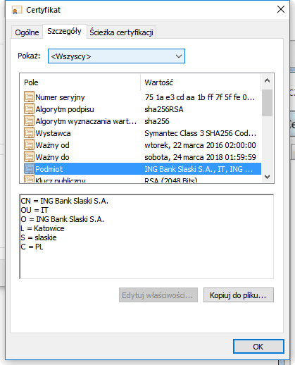 Szczegóły podpisu sha256 powinny wyglądać jak na poniższym ekranie: