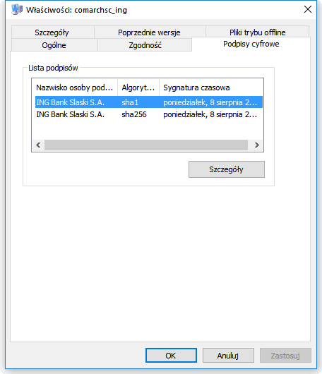 Dokument jest cyfrowo podpisany. W celu sprawdzenia podpisu rozpakuj powyższy plik, wybierz plik comarchsc_ing.exe prawym przyciskiem myszy i wybierz opcję Właściwości. W zakładce Podpisy cyfrowe może zweryfikować czy pobrany plik został podpisany przez ING Bank Śląski S.A.