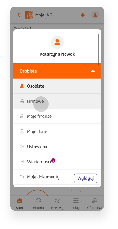 1. Jeśli masz konto osobiste i firmowe, do których logujesz się tym samym loginem – możesz się przełączać pomiędzy kontami w aplikacji. Zaloguj się do aplikacji, przejdź do swojego profilu i wybierz „Firmowe”