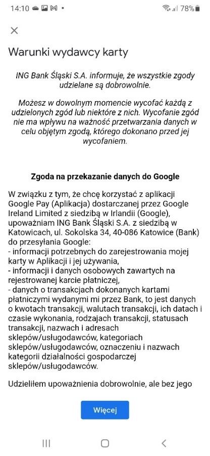 На наступному екрані відобразяться необхідні згоди на передачу даних в Google. Щоб пройти далі, натисніть на синій прямокутник з написом Więcej.
