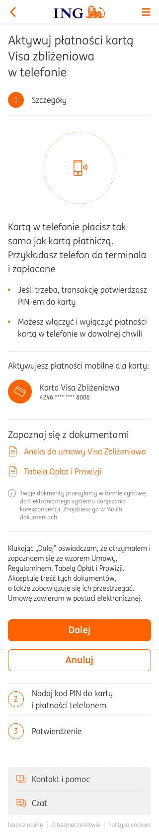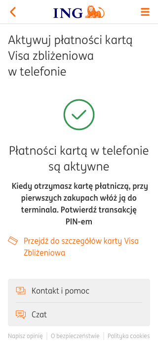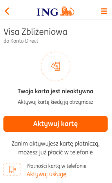 Відразу після замовлення безконтактної картки Visa до рахунку, у застосунку Moje ING ви можете активувати її для оплат за допомогою телефону і здійснювати безготівкові та готівкові транзакції.