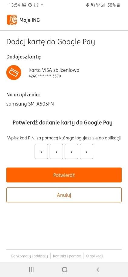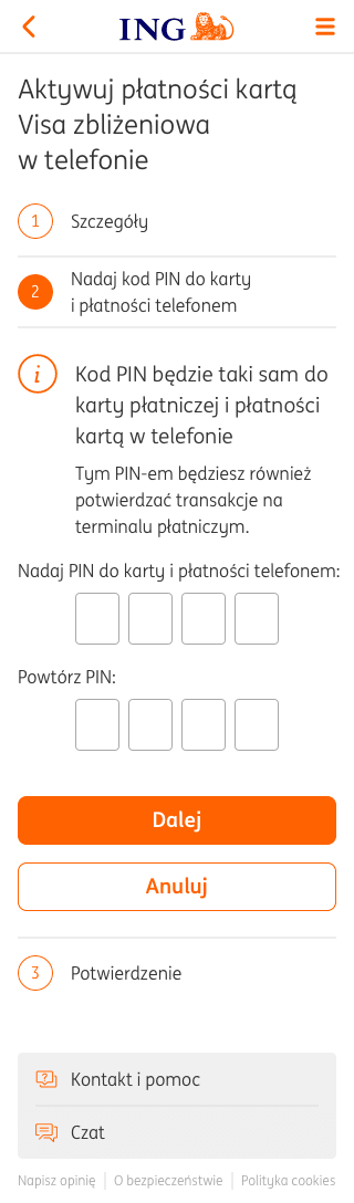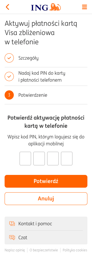 Щоб підтвердити активацію оплати карткою в телефоні, введіть PIN-код, за допомогою якого ви входите в мобільний додаток Moje ING. Потім клацніть помаранчевий прямокутник із написом Potwierdź.