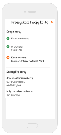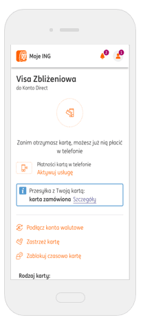 Картку можна замовити під час оформлення рахунку у відділенні банку. Ми надішлемо її протягом 8 робочих днів звичайним листом. Картка буде неактивна. Ви побачите статус надсилання картки і приблизну дату її доставки в Moje ING у деталях картки.