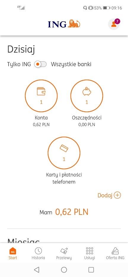 Щоб активувати оплату безконтактною карткою VISA на телефоні, увійдіть у програму Moje ING. Клацніть на коло з написом Karty i płatności telefonem.