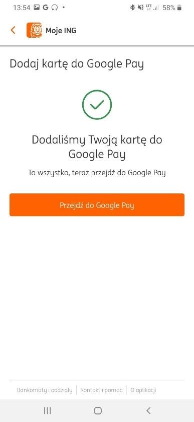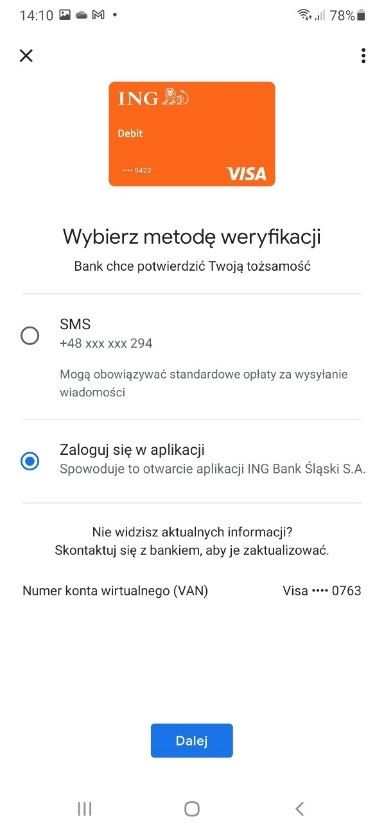Потім виберіть спосіб підтвердження для додавання картки в платіж Google Pay (Google Pay). Виберіть другий варіант підтвердження за допомогою застосунку Moje ING (другий варіант у списку) і натисніть синій прямокутник з написом Dalej.