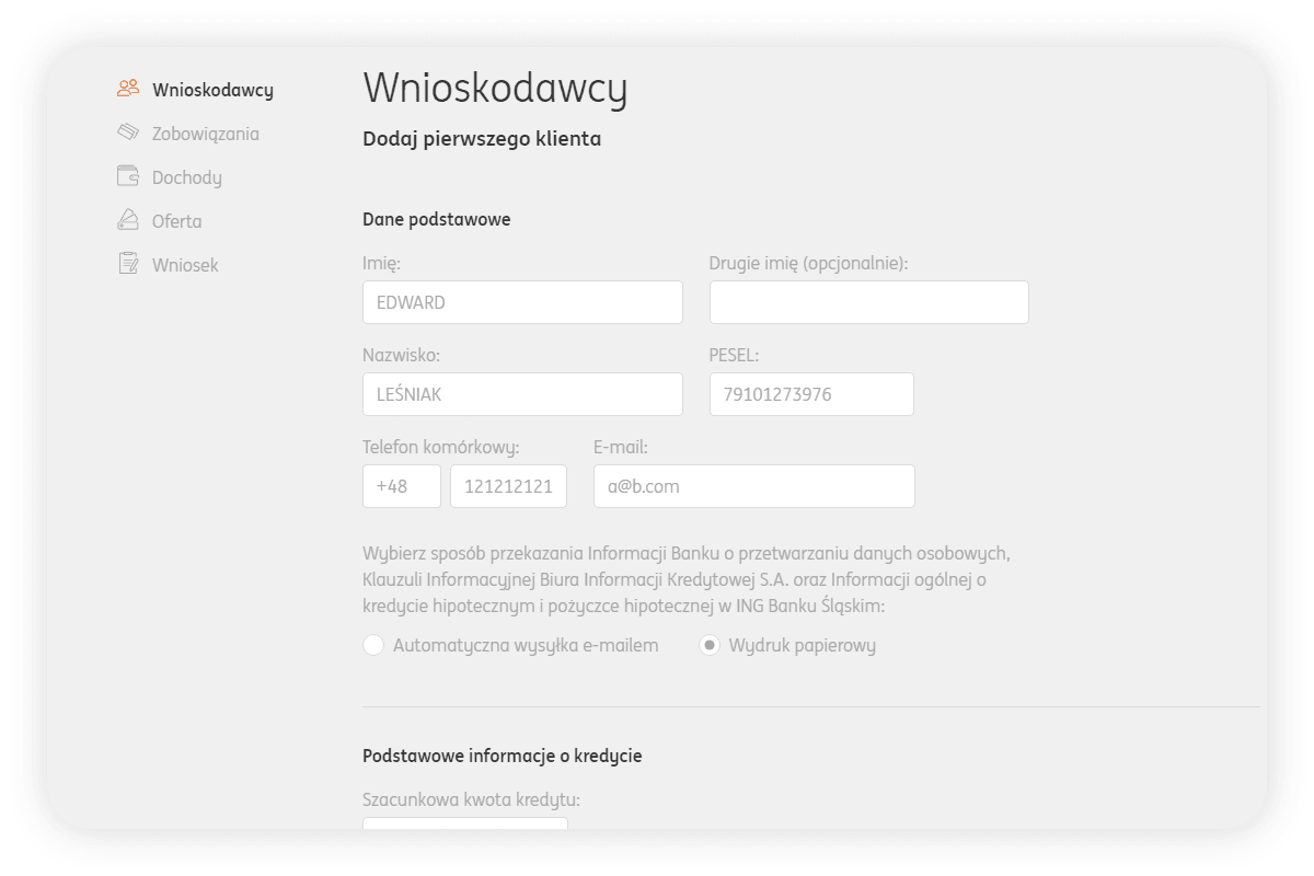 Zwróć uwagę, że dokumenty związane z kredytem hipotecznym będziemy przesyłać na adres email pierwszego wprowadzonego klienta - rozpocznij wprowadzanie wniosku od danych tej osoby.
