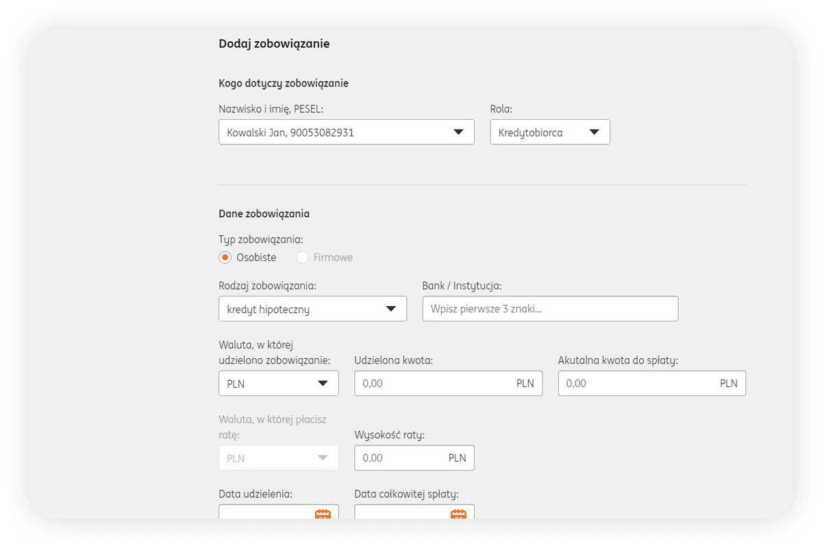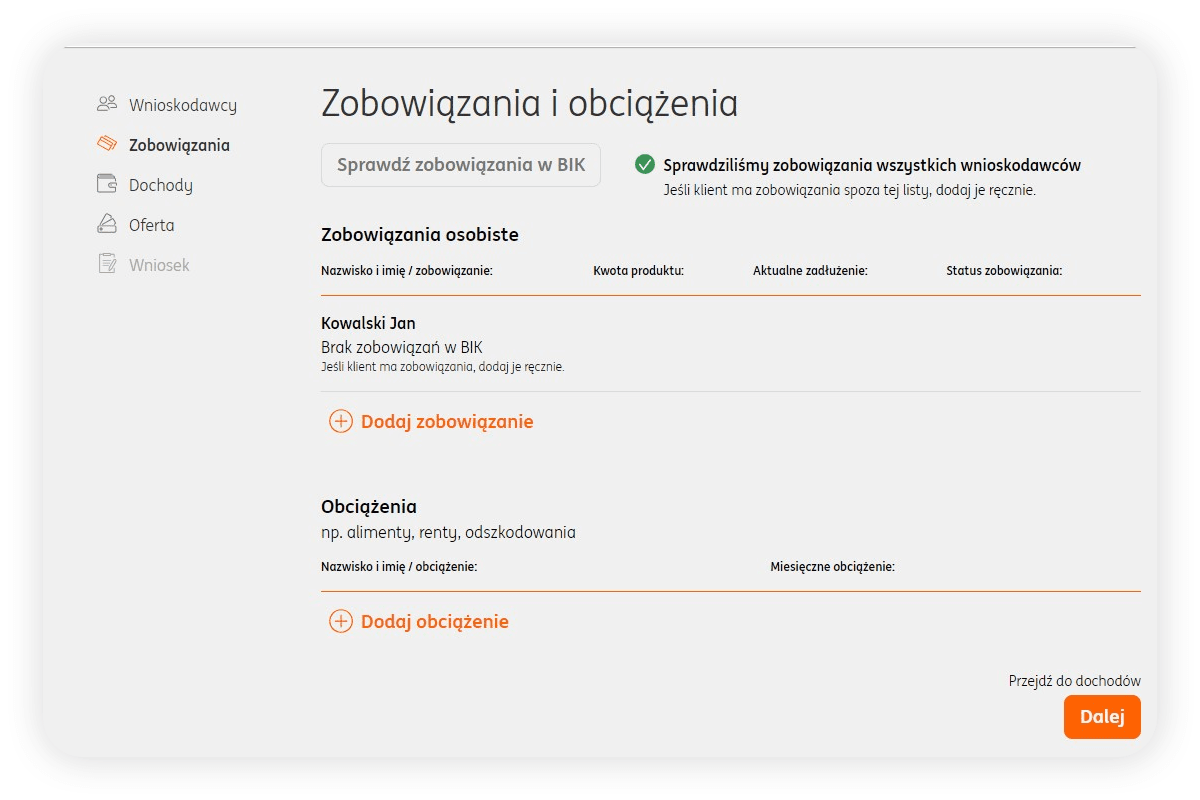 - Korzystajac z przycisku Dodaj zobowiązanie, uzupełnij ręcznie zobowiązania osobiste, które zadeklarował klient, a które nie występują w BIK.