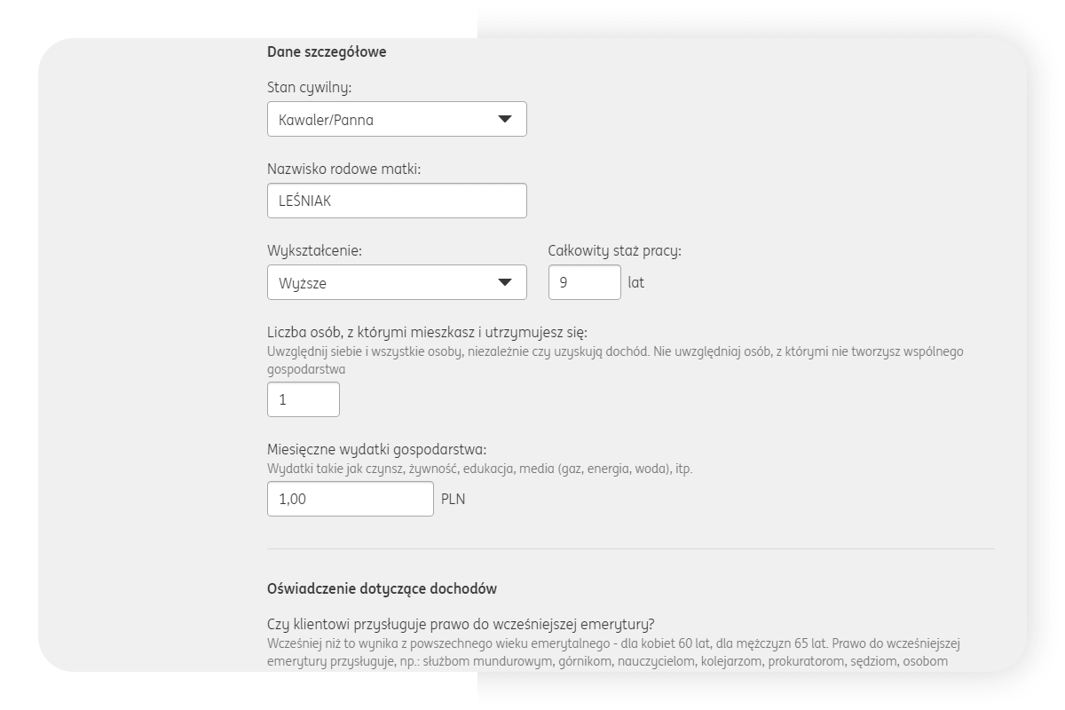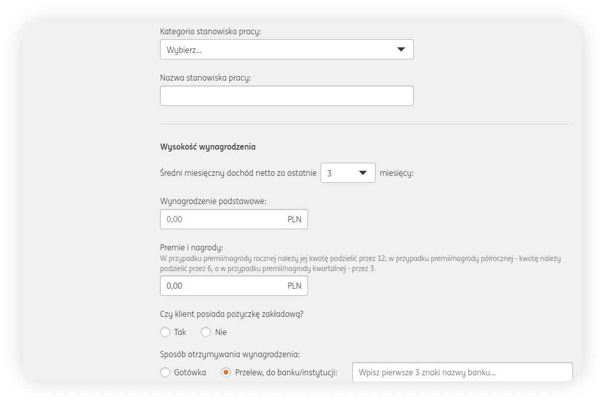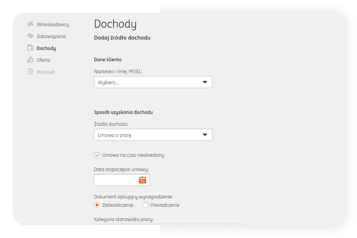 - Wysokość dochodu możesz wpisać na podstawie deklaracji klienta, jeśli nie masz możliwości zweryfikowania tego przy pierwszym spotkaniu z klientem.