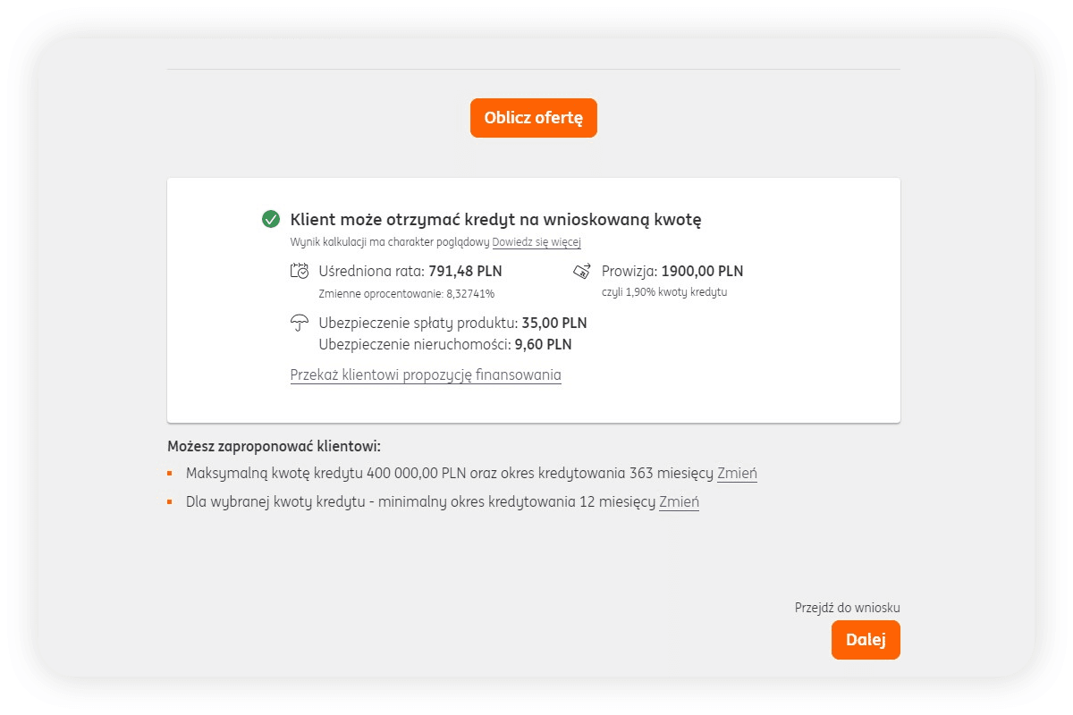 - Dopasuj kwotę kredytu, okres kredytowania i wysokość raty do potrzeb klienta.