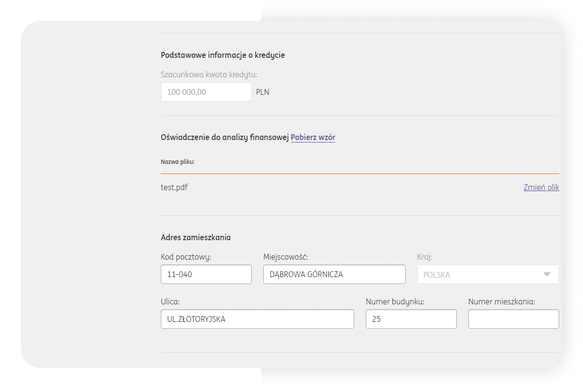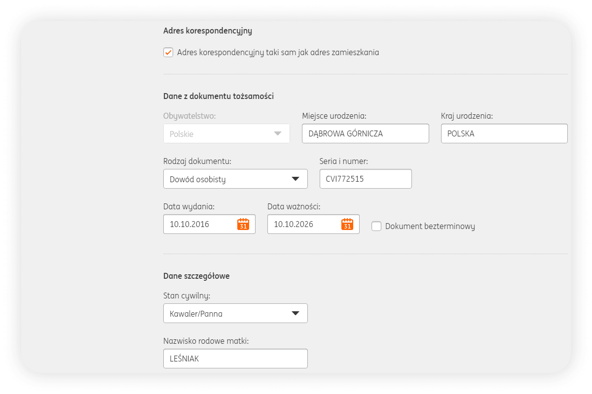 Dla klienta ING dane adresowe oraz dane z dokumentu tożsamości mogą zostać zaczytane automatycznie. W takim przypadku zweryfikuj z klientem ich poprawność - dokonaj stosownej korekty.