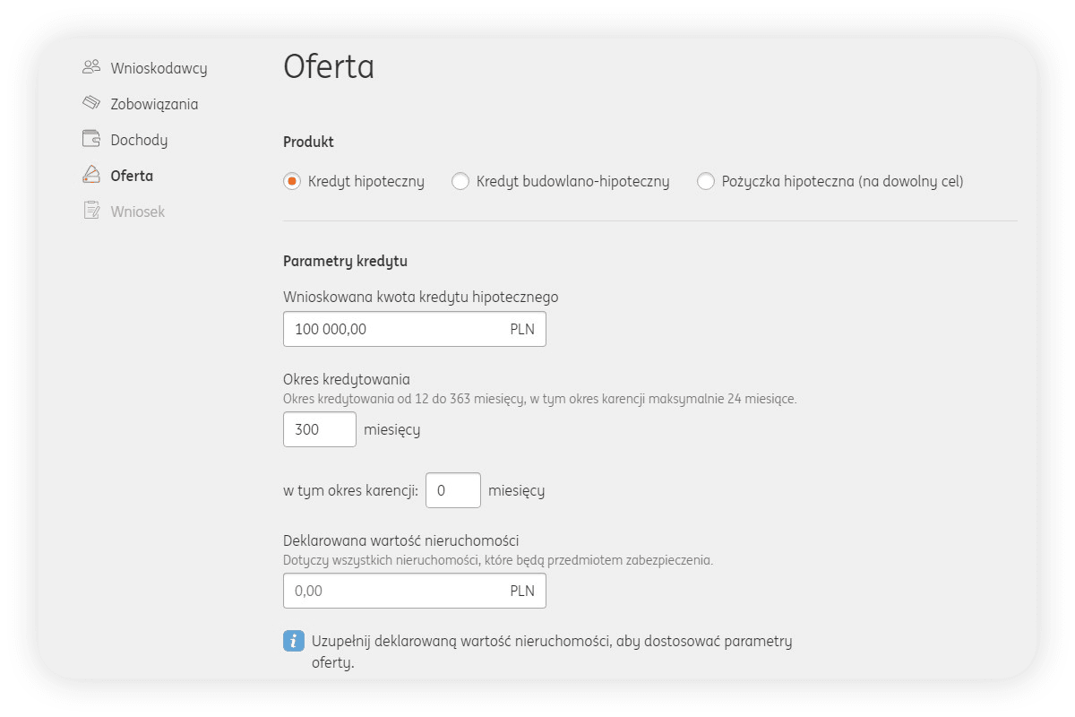 - Przeliczając ofertę, gdy celem kredytowania jest tylko zakup - jako wartość nieruchomości wpisz cenę jej zakupu. W innym przypadku - wpisz wartość z operatu.