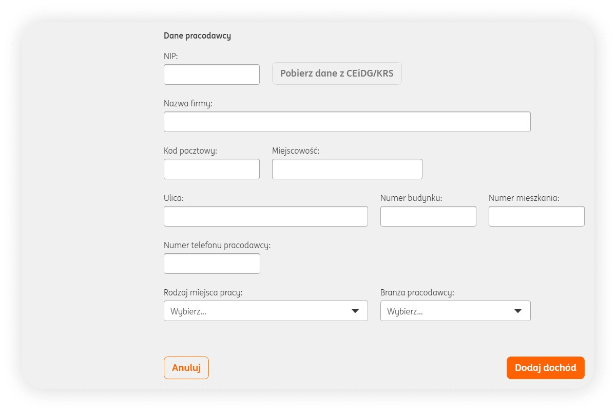 Uzupełnij wysokość dochodu oraz okres zatrudnienia