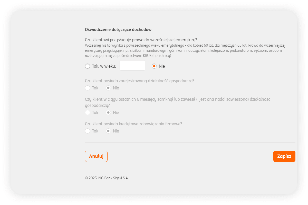 - Gdy dochód klienta wpływa do ING, jako dokument potwierdzający wybierz Oświadczenie - nie przyjmuj formularza od klienta.