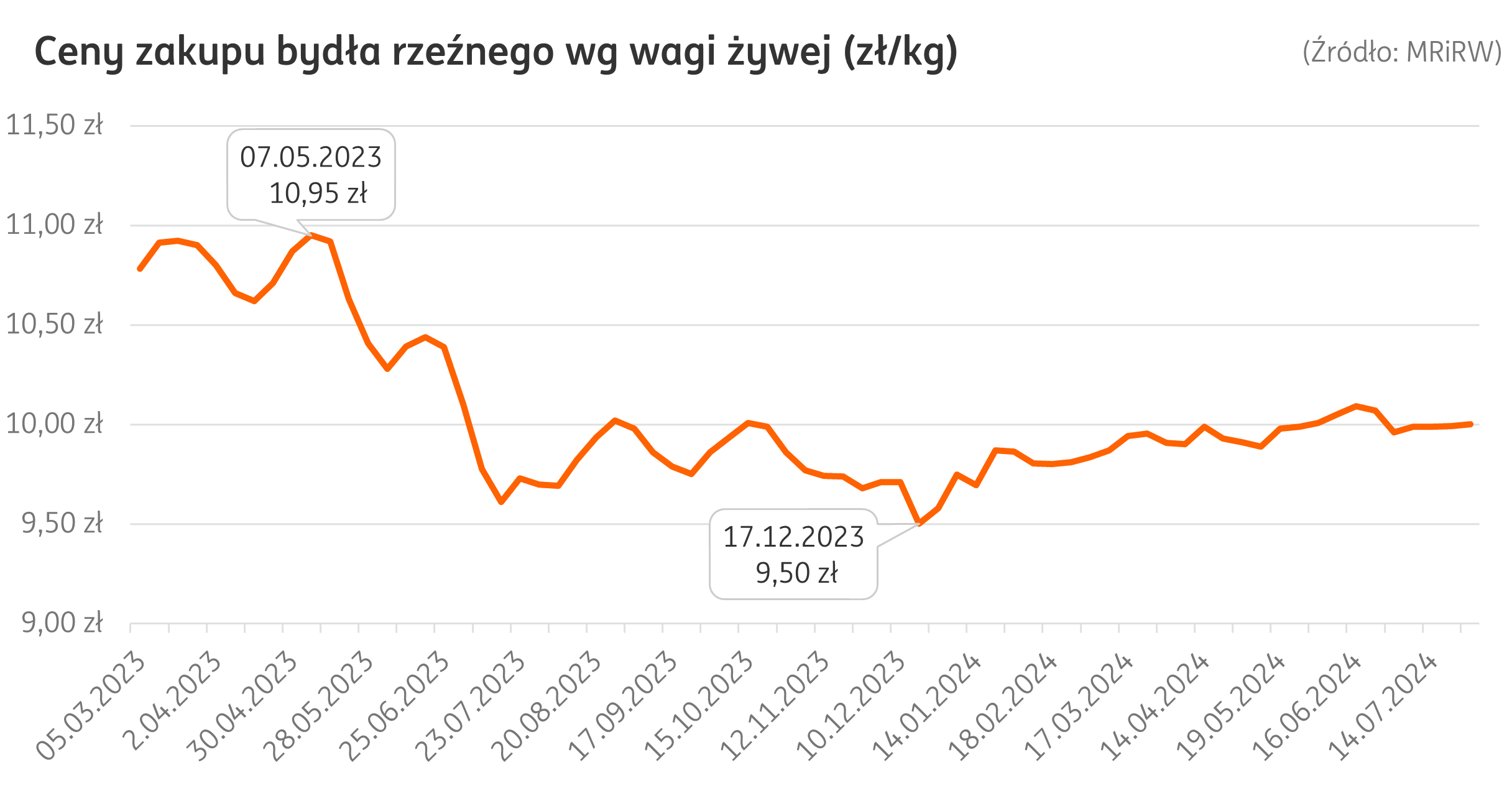 W drugiej połowie lipca notowania bydła w większości odnotowały wzrosty. Średnio stawki zwiększyły się o 0,4%. Najwięcej w ostatnich tygodniach podrożało młode bydło (pow. 3%). Taniały jałówki i krowy. W stosunku do danych sprzed roku wszystkie grupy bydła są aktualnie na wyższych poziomach, przeciętnie 3,1% r/r.