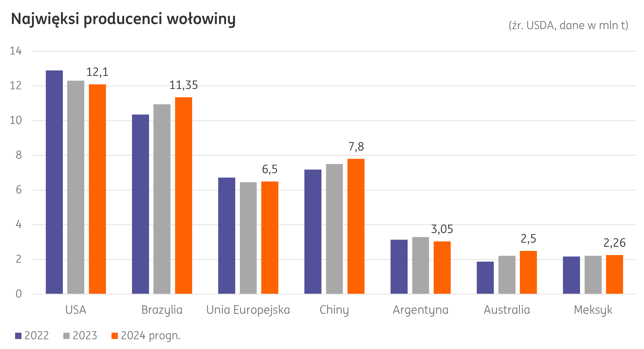 Świat: Zgodnie z danymi USDA (Departament Rolnictwa USA) prognoza globalnej produkcji wołowiny na rok 2024 nieznacznie wzrośnie w stosunku do 2023 r. i wyniesie 60,7 mln t (+1,3% r/r). Spadający wolumen w Stanach Zjednoczonych zostanie skompensowany z nadwyżką wzrostami w Australii, Brazylii, Chinach.