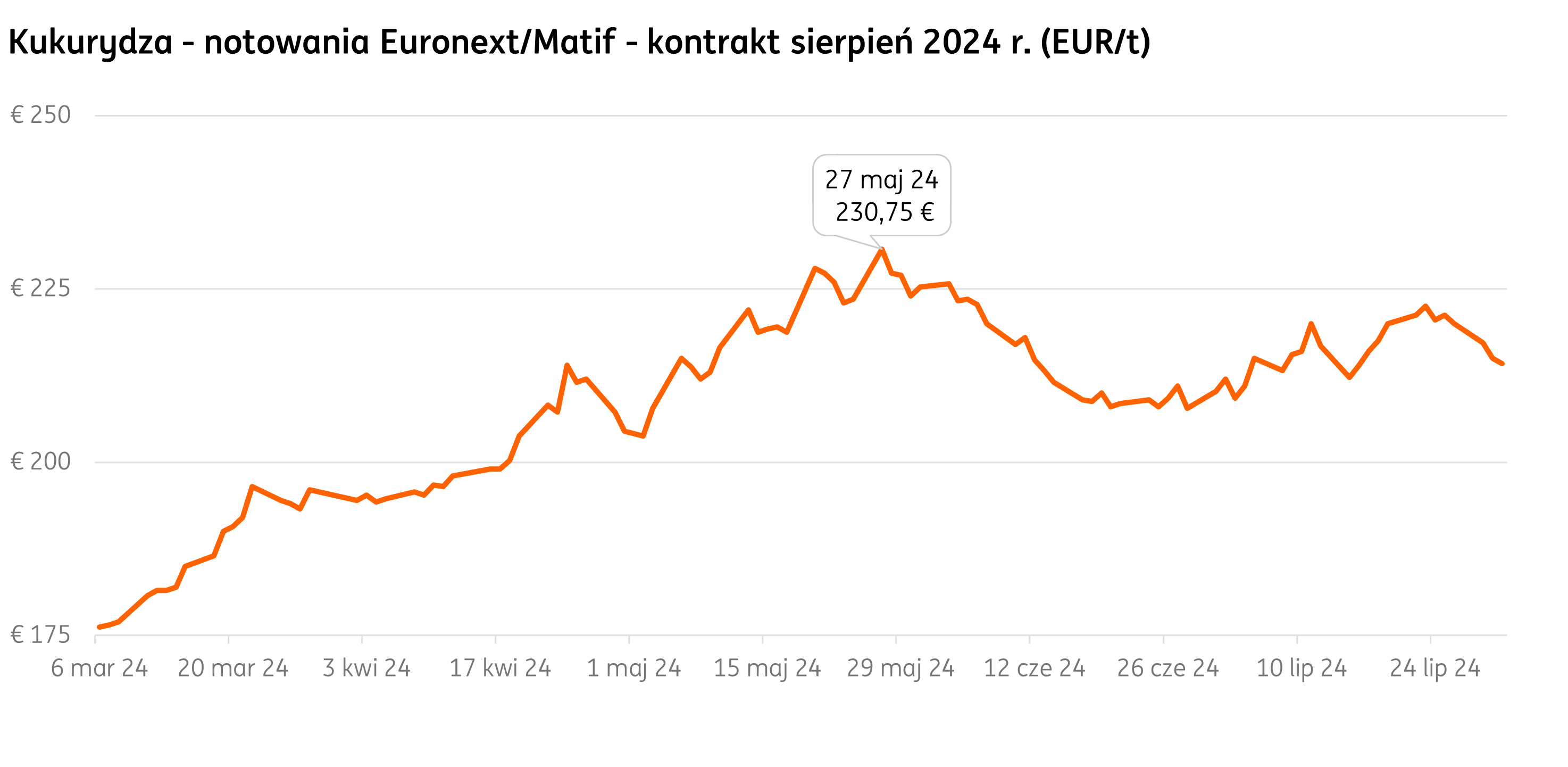 Sierpniowy kontrakt na kukurydzę rozpoczął miesiąc z poziomu 210 €. W drugiej części miesiąca notowania przekroczyły 220 €, jednak wraz z kolejnymi dniami dominować zaczął trend spadkowy.