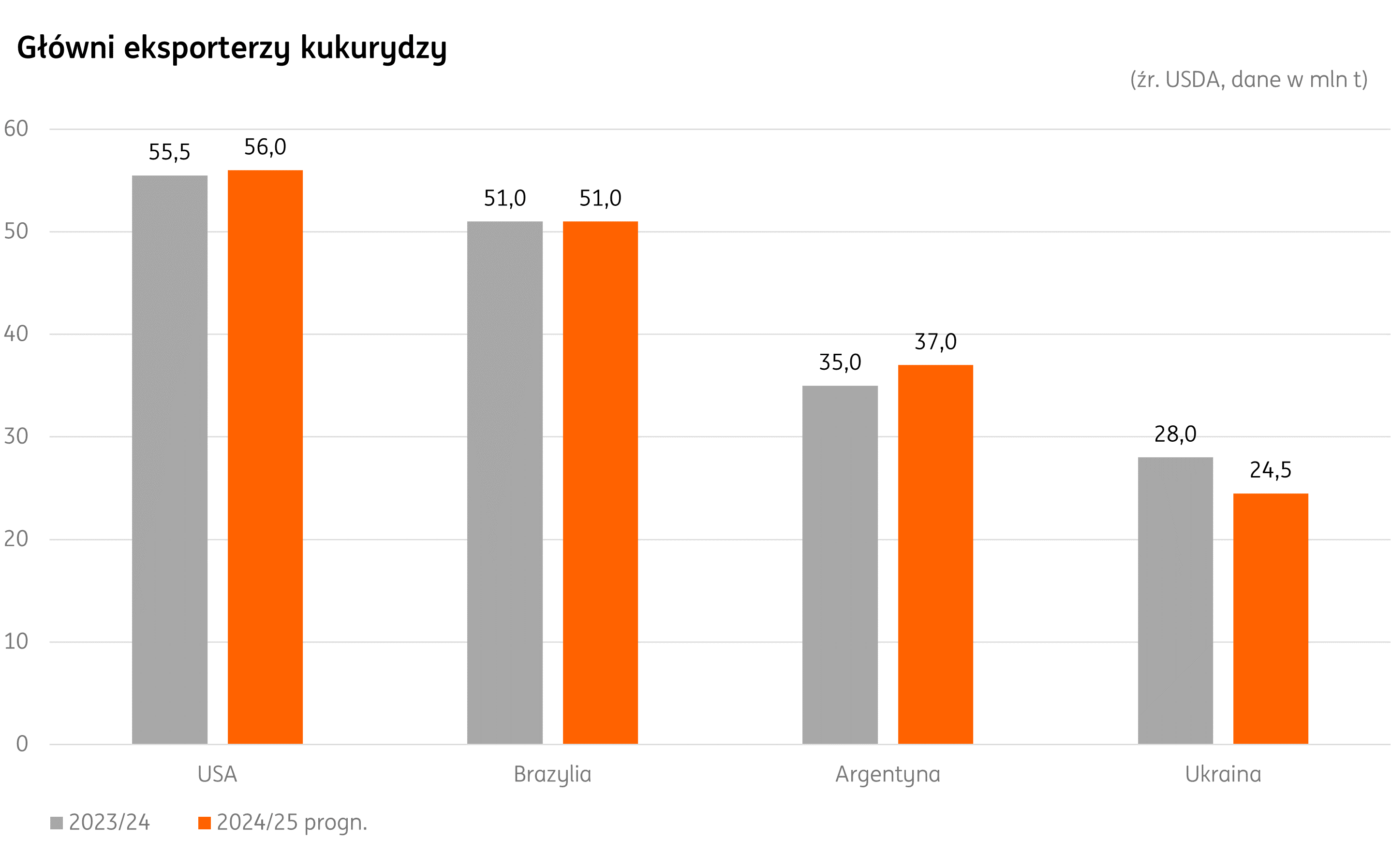 UE: Na starcie sezonu 2024/25 eksport kukurydzy z krajów Unii Europejskiej wyniósł ponad 87 tys. t. To o 28% mniej r/r. Najwięcej ziarna trafiło do Wielkiej Brytanii (77%). Import z kolei jest wyższy niż przed rokiem. Wartość 1,4 mln t jest o 40% wyższa niż w 2023/24 r. Najwięcej kukurydzy sprowadzono z Ukrainy (64% ogółu).