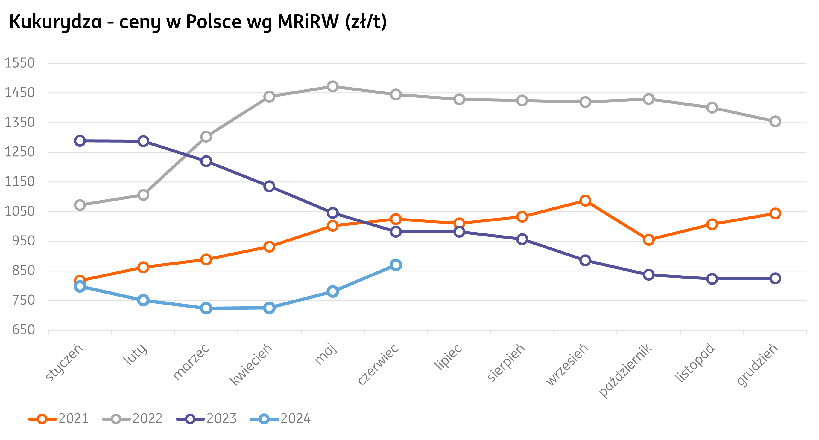 Zgodnie z systemem informacji MRiRW kukurydza paszowa w czerwcu 2024 r. kontynuowała podwyżki. Wartość 870 zł/t w ujęciu miesięcznym była o 90 zł większa. W porównaniu z czerwcem 2023 r. stawka jest niższa o 112 zł (-11%).