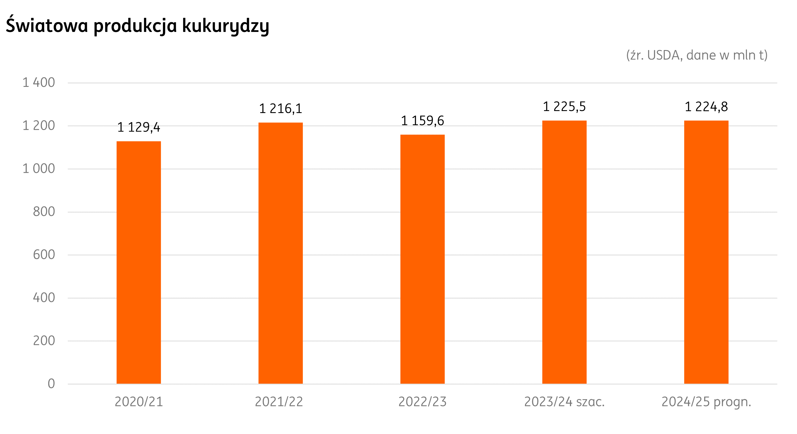 Prognoza minimalnie wzrostowej produkcji połączonej z brakiem zmian w konsumpcji wpłynęła na szacunki dotyczące zapasów końcowych w sezonie 2024/25. Ich wolumen prognozowany jest na niespełna 312 mln t. To pierwsza w trwającym sezonie podwyżka oczekiwanego poziomu zapasów końcowych.