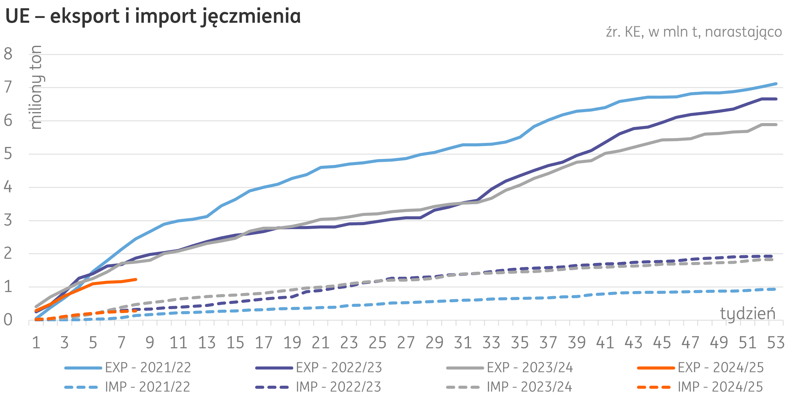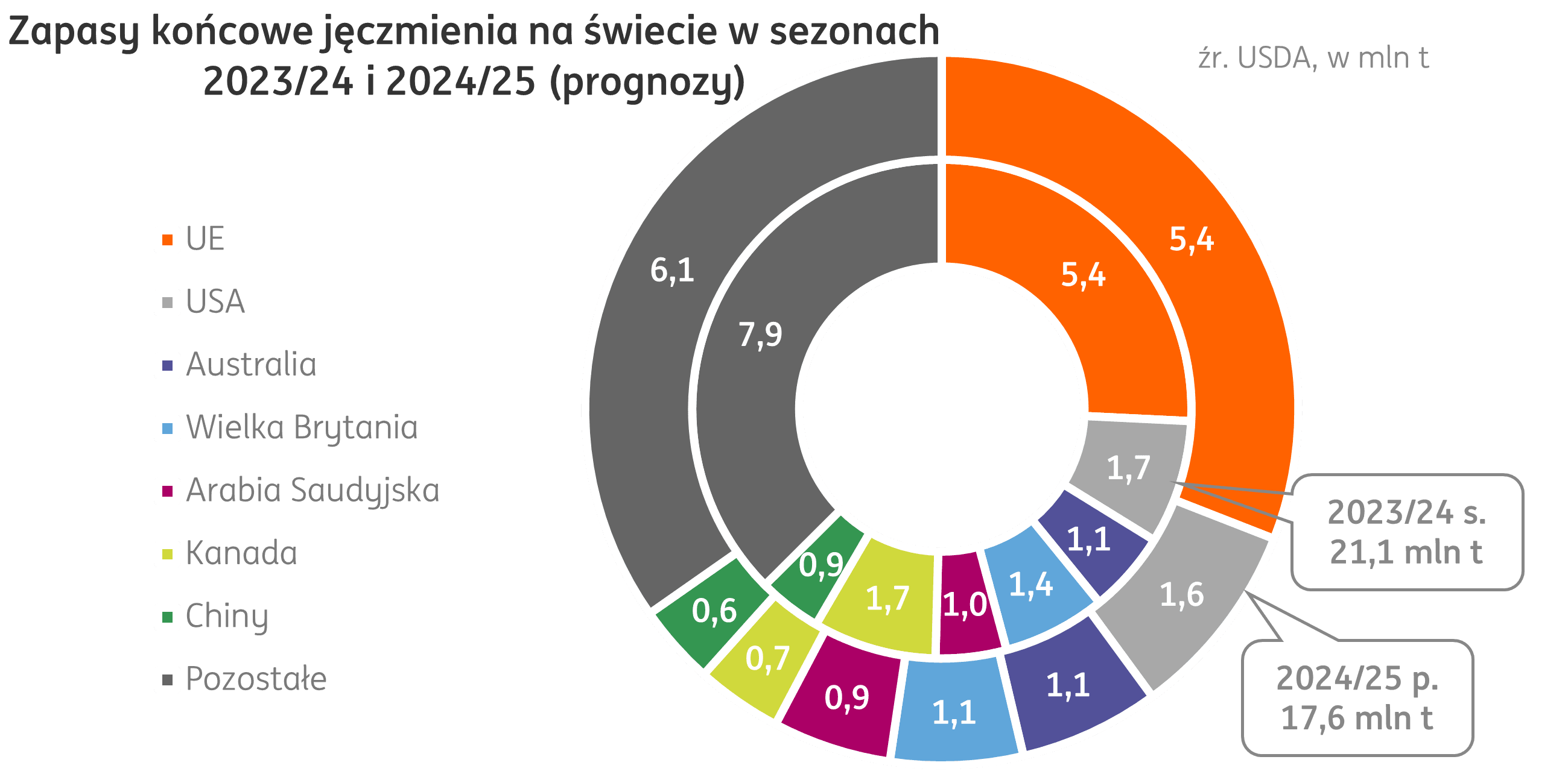 Unia Europejska. Prognozowane przez KE zużycie jęczmienia w sezonie 2024/25 jest na poziomie 42,1 mln t, to o 1,0 mln t więcej niż w ubiegłym sezonie. Podwyższone zużycie wiąże się ze zmniejszonymi szacunkami produkcji pszenicy i kukurydzy, co przełożyło się na niższe zużycie na spasanie tych zbóż, a przewiduje się zastąpienie ich jęczmieniem. Eksport prognozowany jest na poziomie 10,3 mln t (+4% r/r), a zapasy końcowe: 4,6 mln t (+15% r/r).
