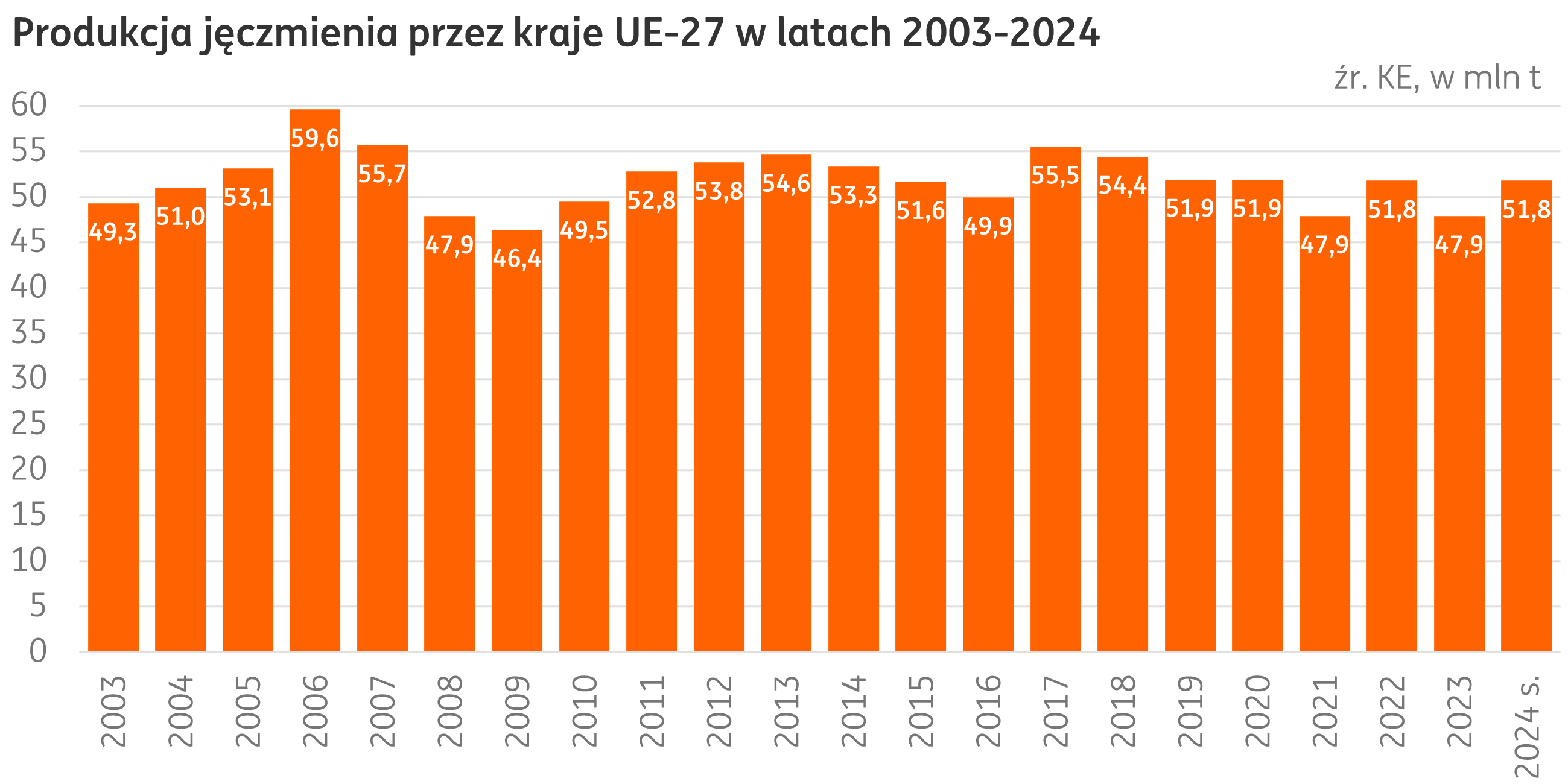 Produkcja. Wstępny szacunek głównych ziemiopłodów rolnych i ogrodniczych w 2024 r., opublikowany przez GUS, wskazuje na uśrednione plonowane jęczmienia na poziomie 4,4 t/ha, to spadek o 2% w relacji rocznej. Łączne zbiory jęczmienia jarego i ozimego w bieżącym sezonie szacowane są na 3,0 mln t, o 3% więcej w porównaniu do ubiegłego roku, a wynik ten został osiągnięty na areale 0,7 mln ha (+5% r/r).