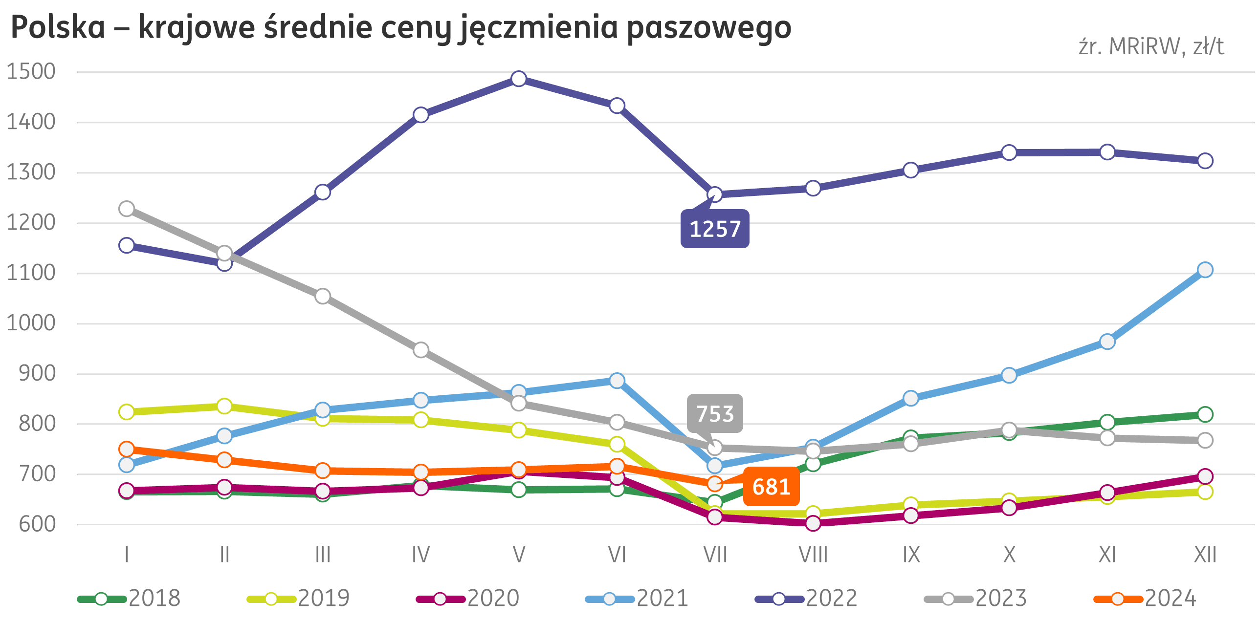 Ceny. Średnia cena jęczmienia paszowego w Polsce, według Biuletynu MRIRW, wyniosła w lipcu 681 zł/t, to spadek o 5% (-35 zł/t) w ujęciu miesięcznym i o 10% niżej (-73 zł/t) w relacji rocznej. Na rynku krajowym na 25 sierpnia 2024 r. średnie ceny jęczmienia paszowego kształtowały się w przedziale 601-718 zł/t.