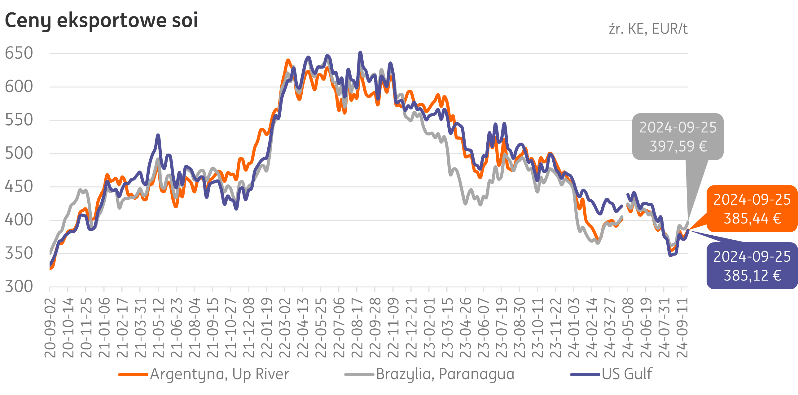 Ceny soi i śruty sojowej. We wrześniu ceny eksportowe soi wzrosły u analizowanych eksporterów tego produktu. Nawyższa cena jest w Brazylii (Paranagua): 398 EUR/t, to wzrost o 8% m/m (-17% r/r). Cena w Argentynie (Up River) wzrosła o 7% w ciągu miesiąca, do poziomu 385 EUR/t (-22% r/r), a w USA (Gulf) na 23 września 2024 r. cena wzrosła również do 385 EUR/t (+10% m/m; -21% r/r).