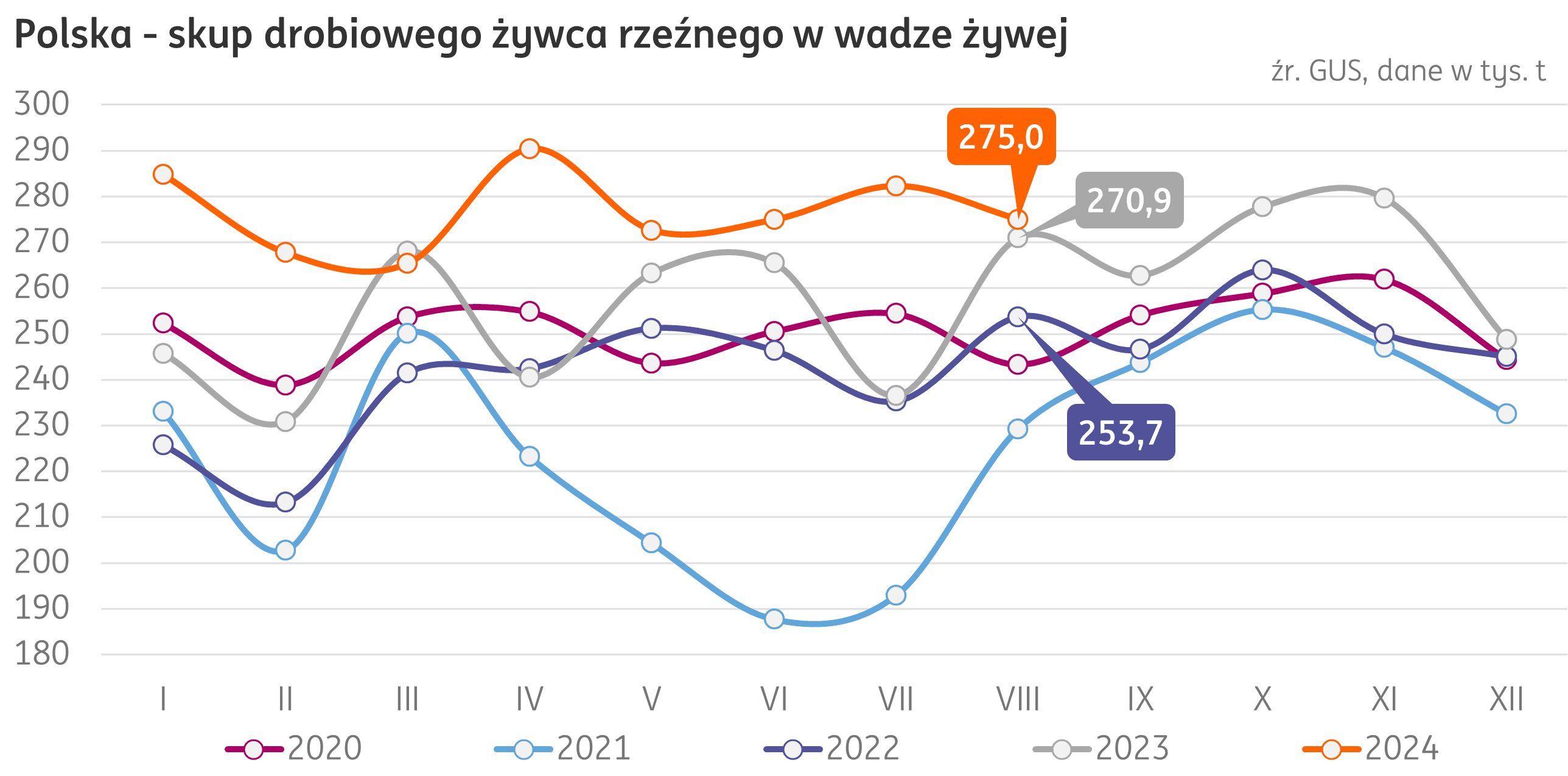 Produkcja. Skup drobiu w Polsce, zgodnie z Biuletynem Statystycznym GUS, osiągnął w sierpniu 2024 r. 275 tys. t, co oznacza wzrost o 1,4% w relacji rocznej. W ciągu ośmiu miesięcy 2024 r. skup na poziomie 2418 tys. t o 9% przewyższa ten z analogicznego okresu ubiegłego roku (+200 tys. t r/r).