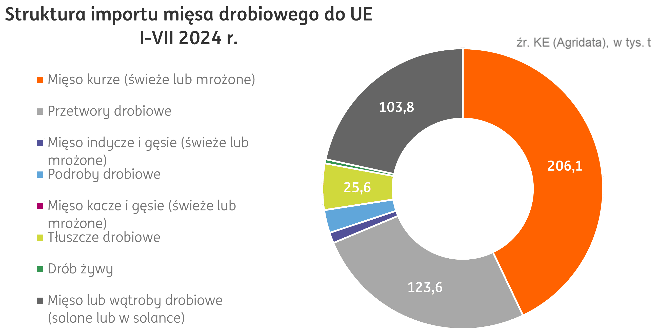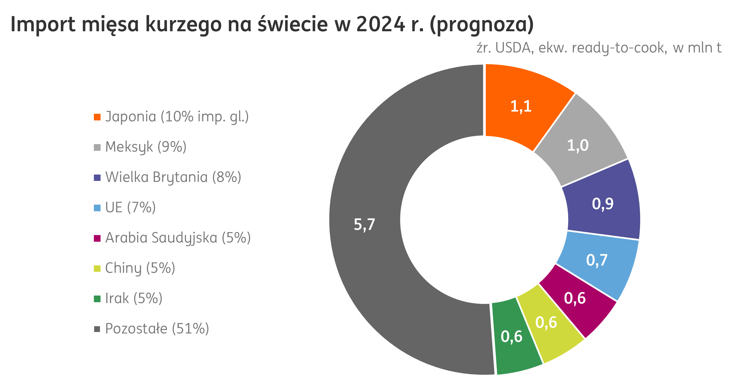 Świat. Globalny handel mięsem kurzym ma w 2024 r. osiągnąć wolumen 13,8 mln t (prognozy USDA), o 0,3 mln t więcej w relacji rocznej. 36% eksportowanego mięsa kurzego pochodzić ma z Brazylii, której eksport jest prognozowany na poziomie 4,9 mln t (+3,3% r/r). Odbiorcy są bardziej rozproszeni, największym z nich jest Japonia, importująca 1,1 mln t (+3,5% r/r) tego produktu rocznie, kolejny jest Meksyk z importem 1,0 mln t (0% r/r) oraz Wielka Brytania z wolumenem 0,9 mln t (+0,5% r/r).