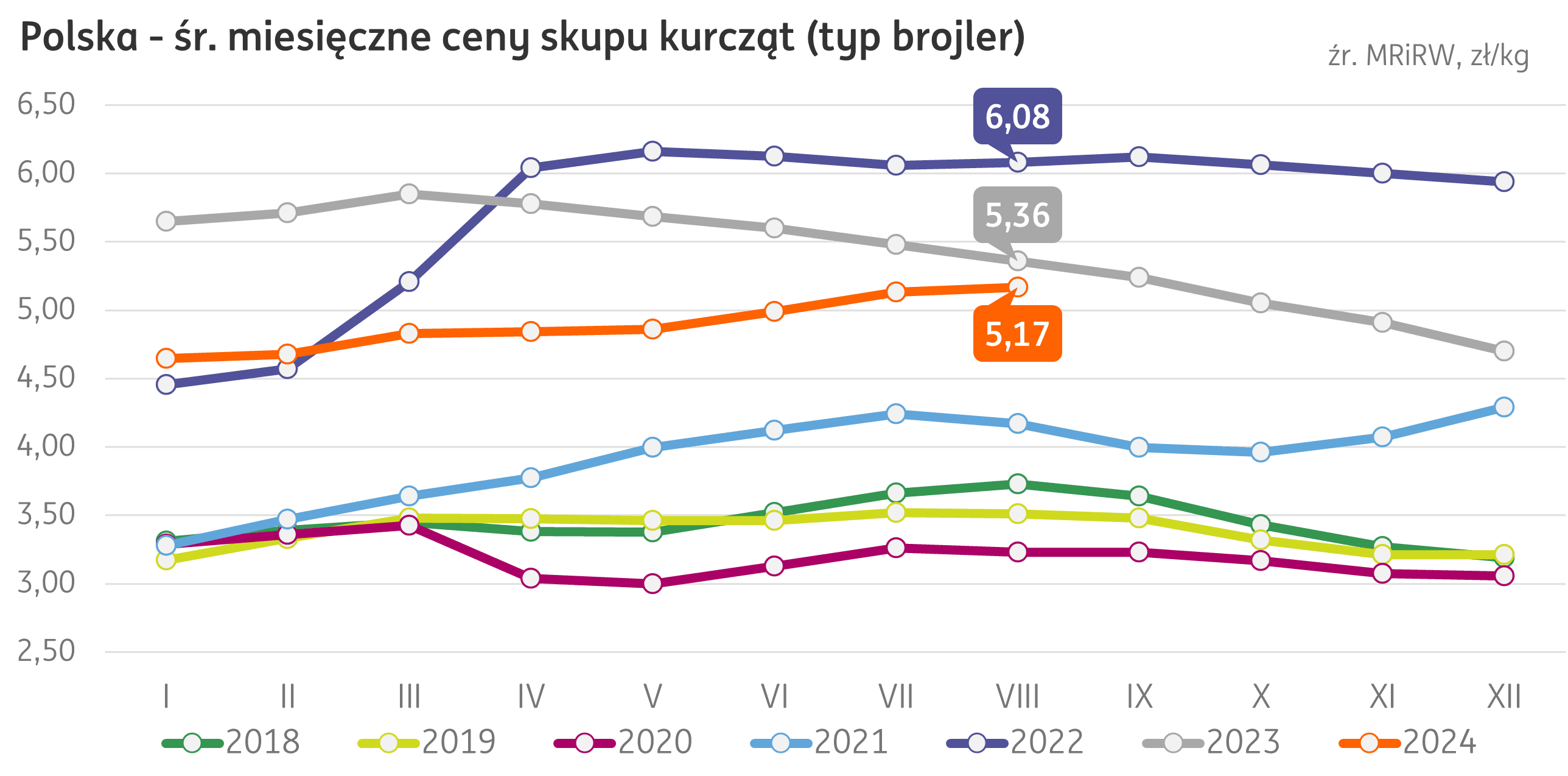 Ceny. Sierpniowa średnia miesięczna cena skupu kurcząt brojlerów w Polsce (publikacja MRiRW) wzrosła do 5,17 zł/kg, o 0,7% w porównaniu do ubiegłego miesiąca. W zestawieniu z 2023 r., cena w sierpniu była o 4% niższa (-0,19 zł/kg r/r).