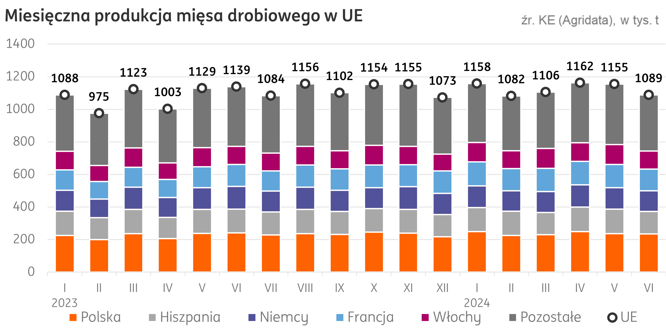 Unia Europejska. W pierwszym półroczu 2024 r. kraje UE wyprodukowały 6,8 mln t drobiu (wg portalu Agridata), o 5% więcej niż w analogicznym okresie ubiegłego roku. Polska, największy producent drobiu w Europie, osiągnęła produkcję 1,4 mln t, stanowiącą 21% produkcji w UE w tym okresie, o 6% większą niż rok wcześniej. Hiszpania, drugi kraj UE pod względem wielkości produkcji drobiu, osiągnęła wolumen 0,9 mln t i wzrost produkcji o 2% w relacji rocznej, spory wzrost zanotowano również we Francji, o 16% w porównaniu do ubiegłego roku, przy produkcji 0,8 tys. t.