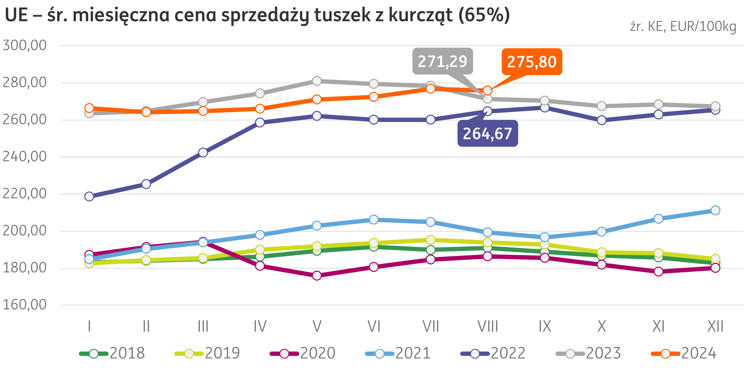 Unia Europejska. Sierpniowa średnia ważona cena tuszki kurczaka (65%) w krajach osiągnęła 275,80 EUR/100kg, spadając o 0,3% w porównaniu do ubiegłego miesiąca, to pierwszy spadek tego wskaźnika od pięciu miesięcy. Średnia cena tuszki kurczaka przekroczyła o 1,7% jego cenę sprzed roku.