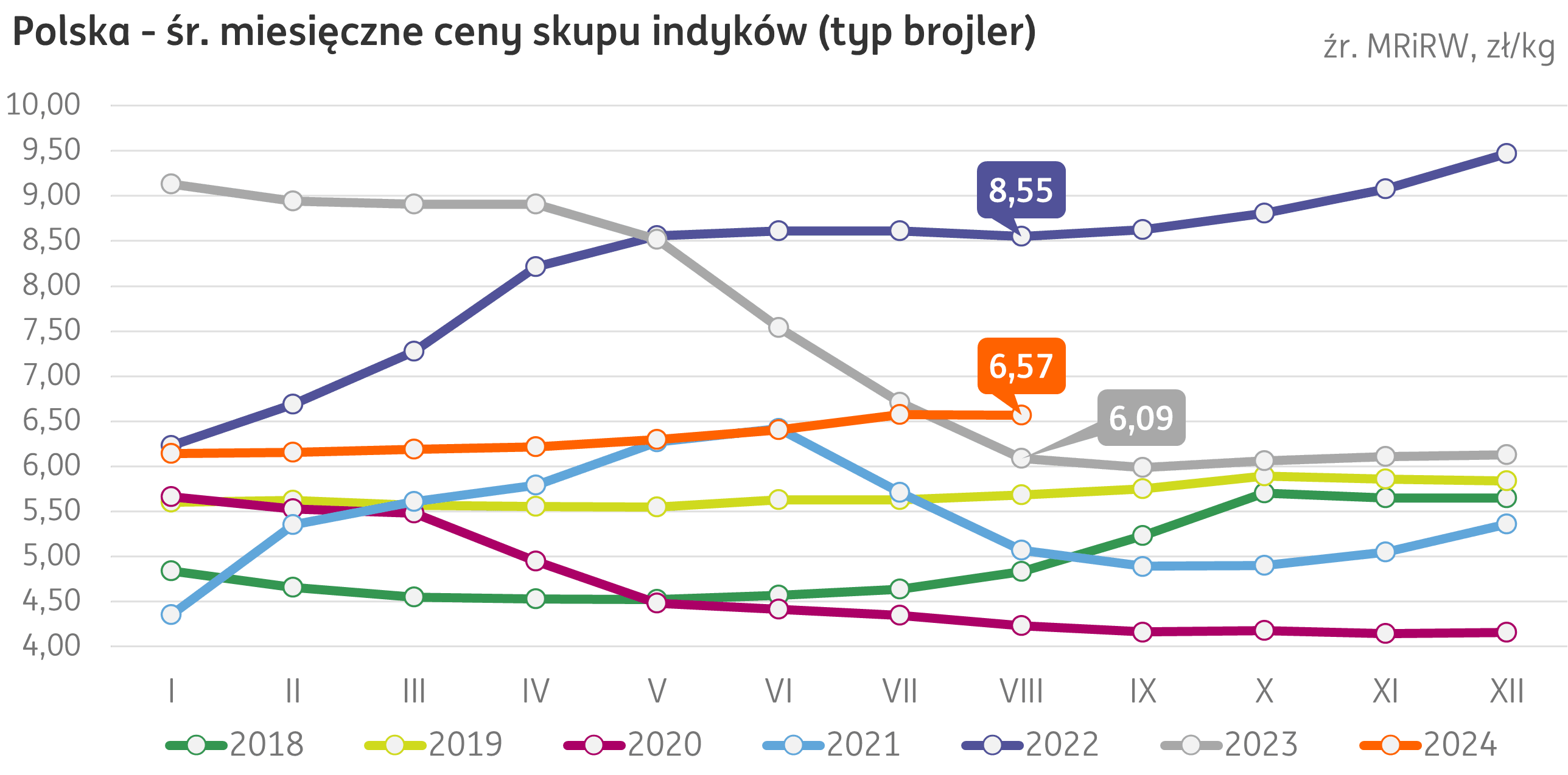 Średnia miesięczna cena skupu indyków (publikacja MRiRW) w sierpniu 2024 r. spadła w ujęciu miesięcznym po raz pierwszy w tym roku, kształtując się na poziomie 6,57 zł/kg (-0,1% m/m). W relacji do sierpnia ubiegłego roku, cena jest wyższa o 8%.