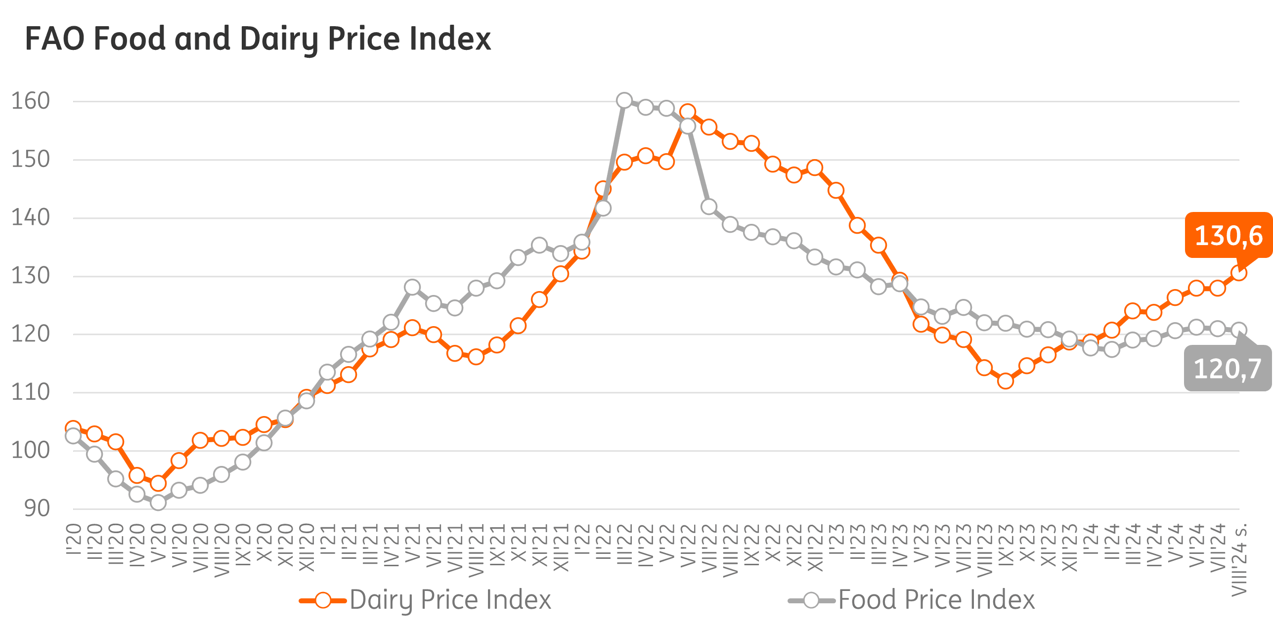 Ceny. Szacowana średnia unijna cena mleka surowego w skupie w sierpniu 2024 r. zgodnie z danymi KE wzrosła do 46,93 EUR/100 kg, o 1,4% w porównaniu do poprzedniego miesiąca, natomiast w relacji do sierpnia 2023 r. cena ta jest wyższa o 7,8%.
