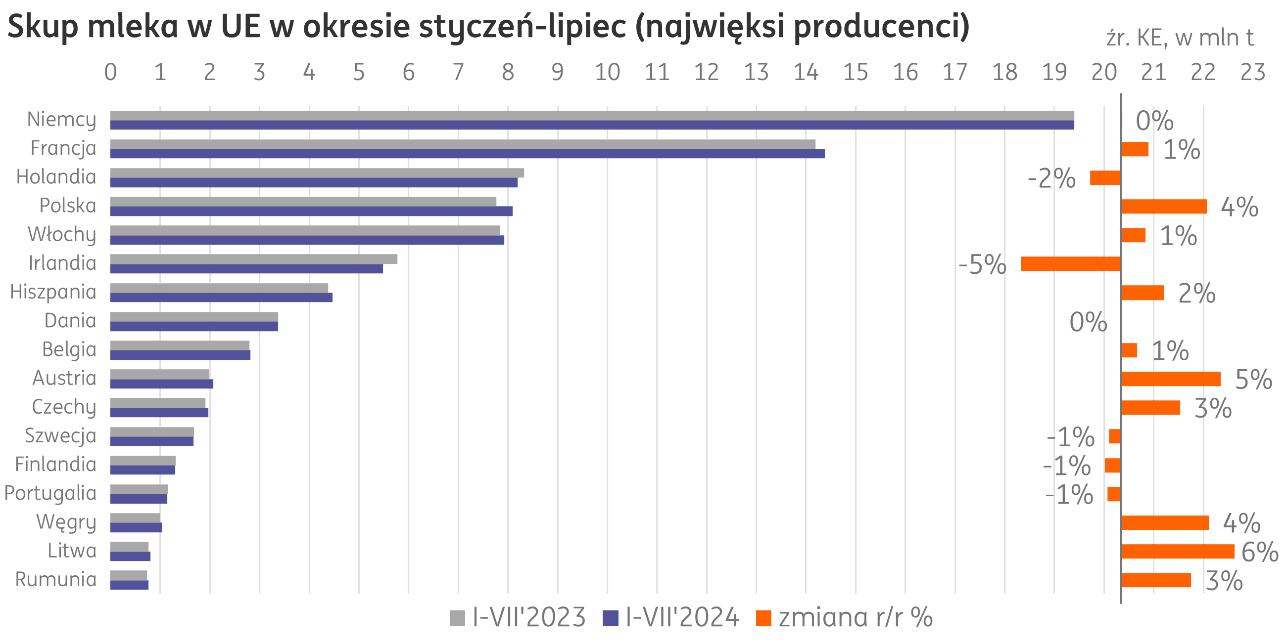 Produkcja mleka. W ciągu siedmiu pierwszych miesięcy 2024 r. w krajach UE skupiono 87,9 mln t mleka krowiego, o 0,7% przekraczając ubiegłoroczny poziom skupu. Niemcy, będące największym unijnym producentem mleka, osiągnęły w tym okresie skup na poziomie 19,4 mln t, analogicznie jak w roku ubiegłym w tym samym okresie. Skup mleka we Francji wzrósł o +1,3% r/r, osiągając 14,4 mln t. Polska produkcja w tym okresie wzrosła do 8,1 mln t, o 4,2% powyżej poziomu notowanego w ubiegłym roku.