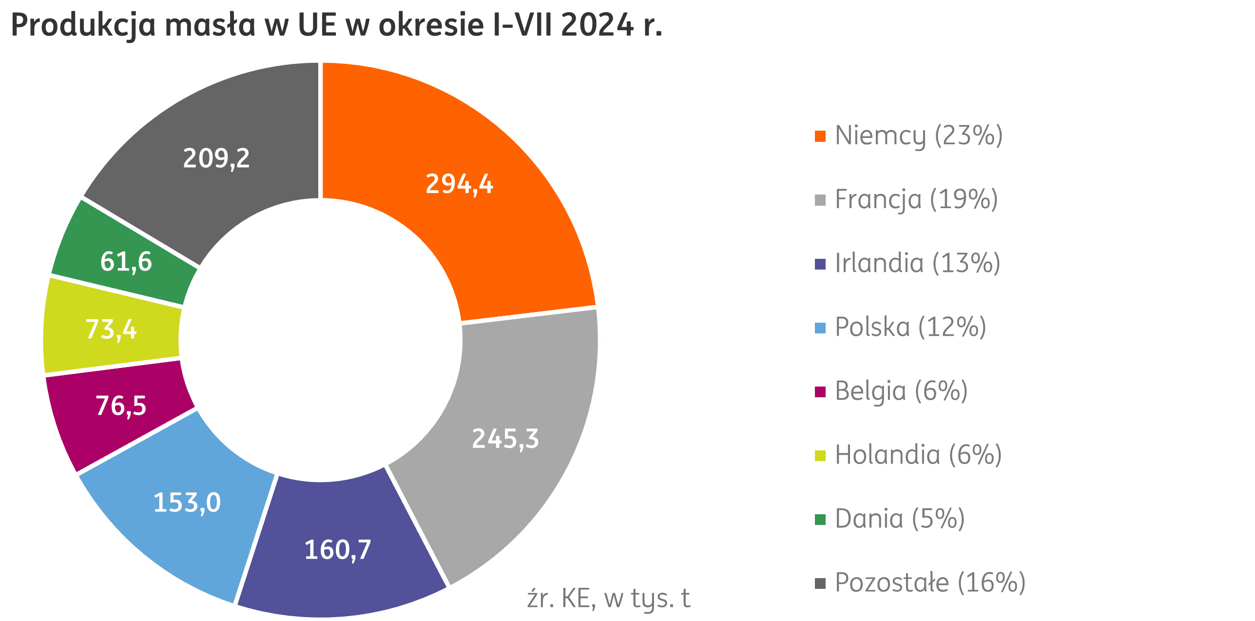 Produkcja masła od początku roku do lipca jest o 1,6% niższa niż w analogicznym okresie ubiegłego roku, łącznie osiągnęła 177 tys. t. Wśród największych producentów produkcja wzrosła jedynie w Belgii (+5,3 tys. t r/r) oraz we Włoszech (+3,0 tys. t). Nie kompensuje to spadków u większości znaczących producentów, m. in. w Irlandii (-10,6 tys. t r/r), w Polsce (-4,3 tys. t r/r), czy we Francji (-3,0 tys. t r/r).