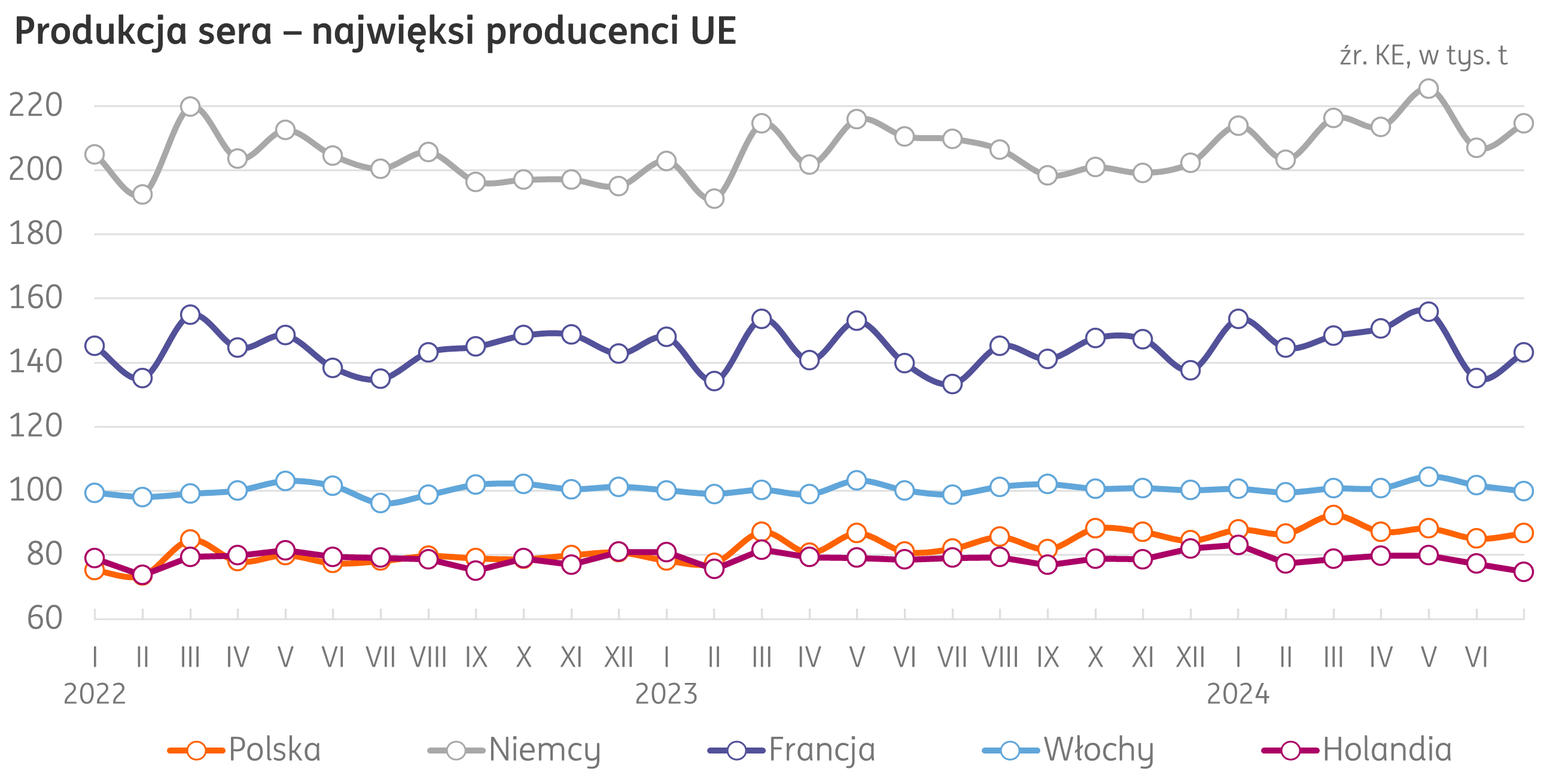Okres I-VII 2024 r. zakończył się zwiększeniem produkcji sera w UE o 3,2% r/r, do 5,6 mln t. Niemal wszystkie kraje UE zwiększyły swoją produkcję w tym okresie, wyjątki to Belgia z produkcja obniżoną o 7% r/r oraz Finlandia i jej produkcja niższa o 5% r/r. Kraje te posiadają niewielki udział w unijnej produkcji (po 1% w analizowanym okresie), co zostało z nadwyżką skompensowane, szczególnie przez dwa kraje osiągające największe wzrosty: Niemcy (+48 tys. t r/r) oraz Polskę (+41 tys. t r/r).
