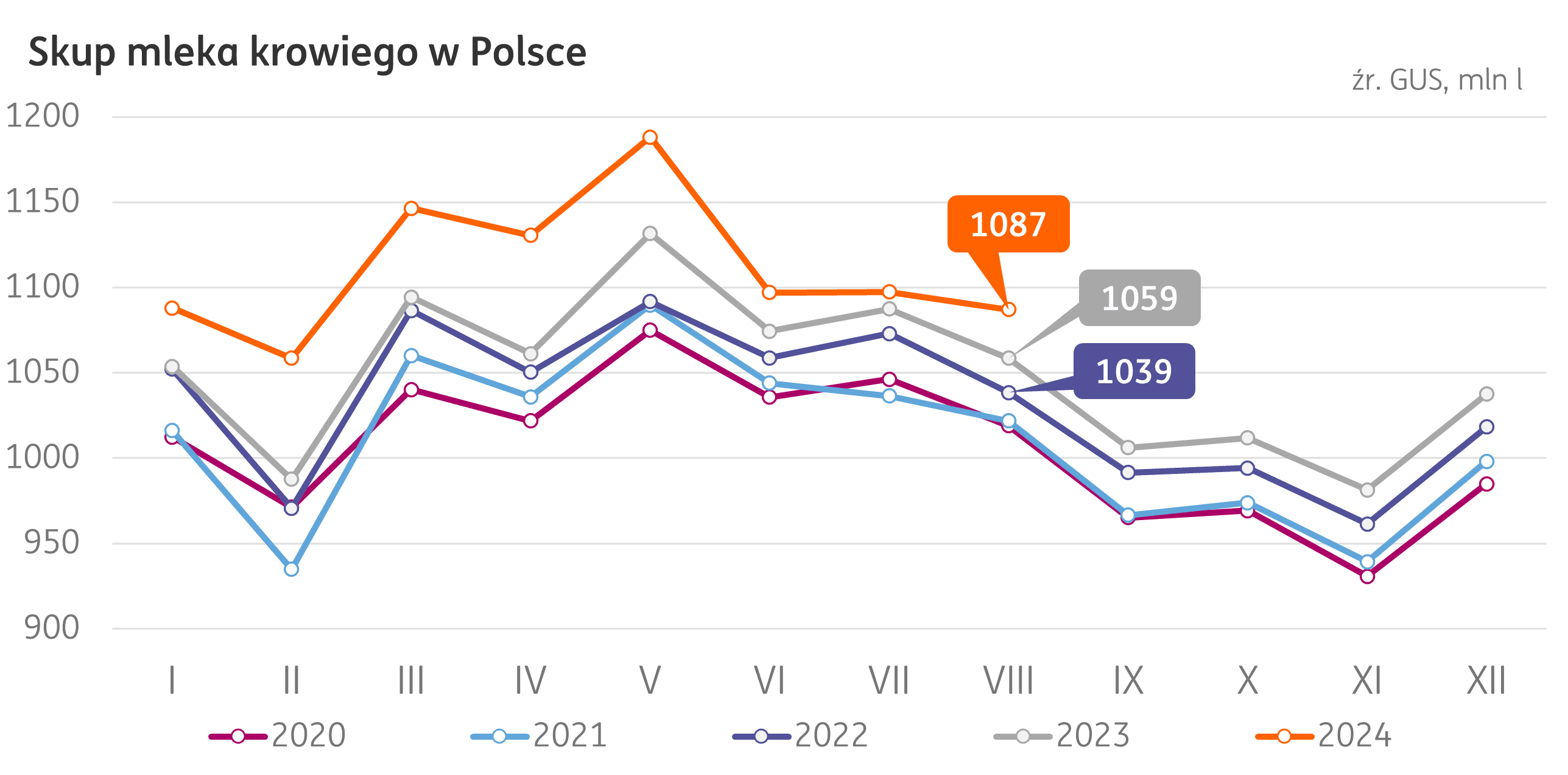 Produkcja mleka. Sierpniowy skup mleka w Polsce, zgodnie z Biuletynem Statystycznym GUS osiągnął 1087 mln l, zwiększając się o 2,7% w relacji rocznej. Od początku roku, skup mleka wyniósł 8929 mln l, to wzrost o 4,0% powyżej poziomu z analogicznego okresu ubiegłego roku (+344 mln l r/r).