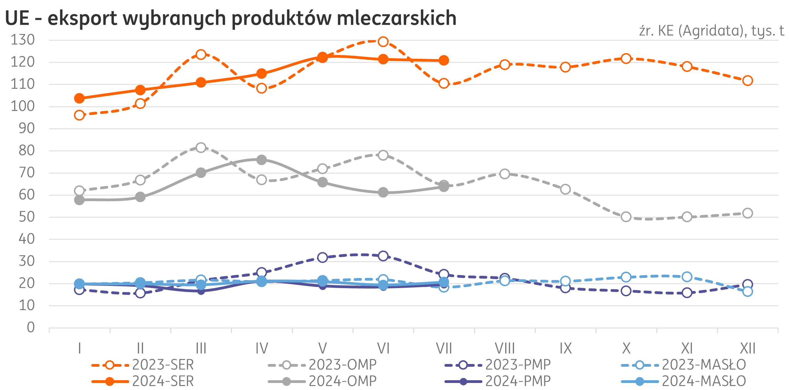 Handel. W okresie I-VII 2024 r., zgodnie z danymi dostępnymi na portalu Agridata (KE), eksport sera z krajów UE wzrósł do 801 tys. t (+1,3% r/r), eksport pozostałych z analizowanych produktów spadł, najwięcej PMP, do 133 tys. t (-20% r/r). Wolumen wyeksportowanego poza UE masła obniżył się do 141 tys. t (-2% r/r), a OMP do 454 tys. t (-8% r/r).