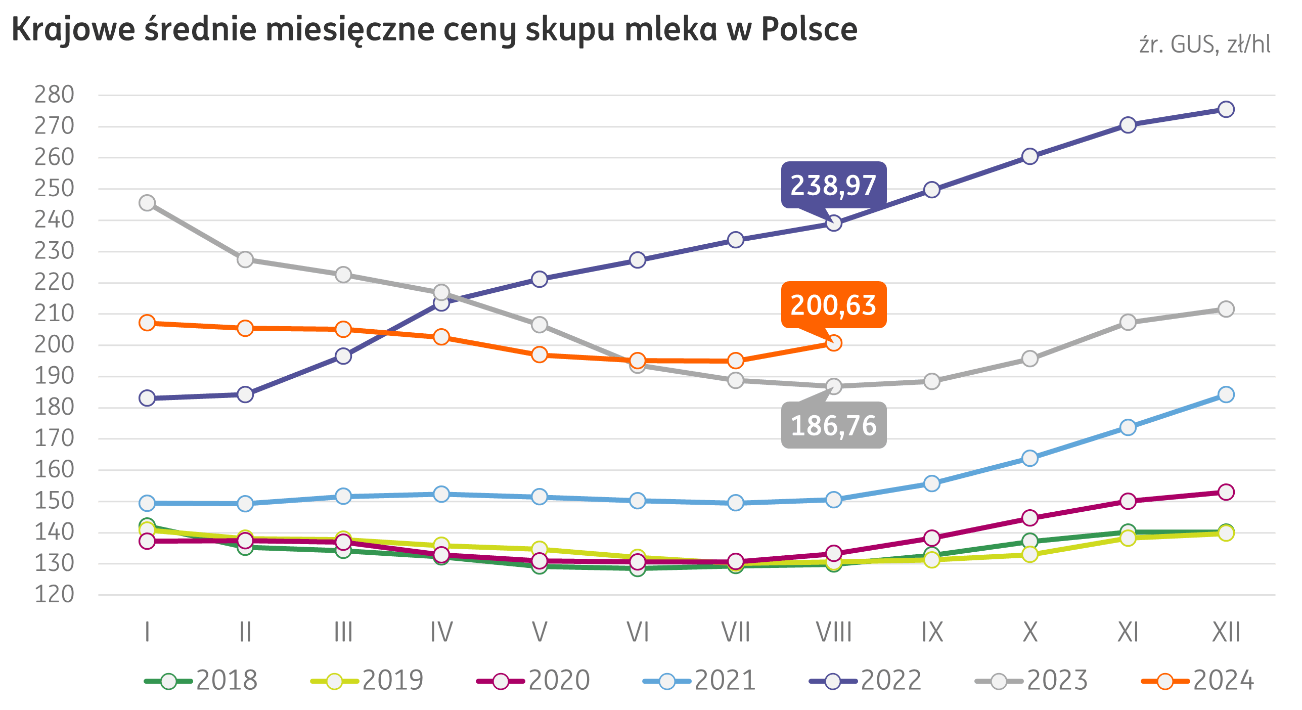 Ceny. W sierpniu 2024 r., według danych z Biuletynu Statystycznego GUS, cena mleka wyniosła 200,63 zł/hl, to wzrost o 2,9% w porównaniu do lipca 2024 r. Sierpień to pierwszy miesiąc w 2024 r, w którym ceny podniosły się w ujęciu miesięcznym. Od początku roku cena obniżyła się o 5,1%, a w zestawieniu z sierpniem 2023 r., cena jednak jest o 2,9% wyższa.