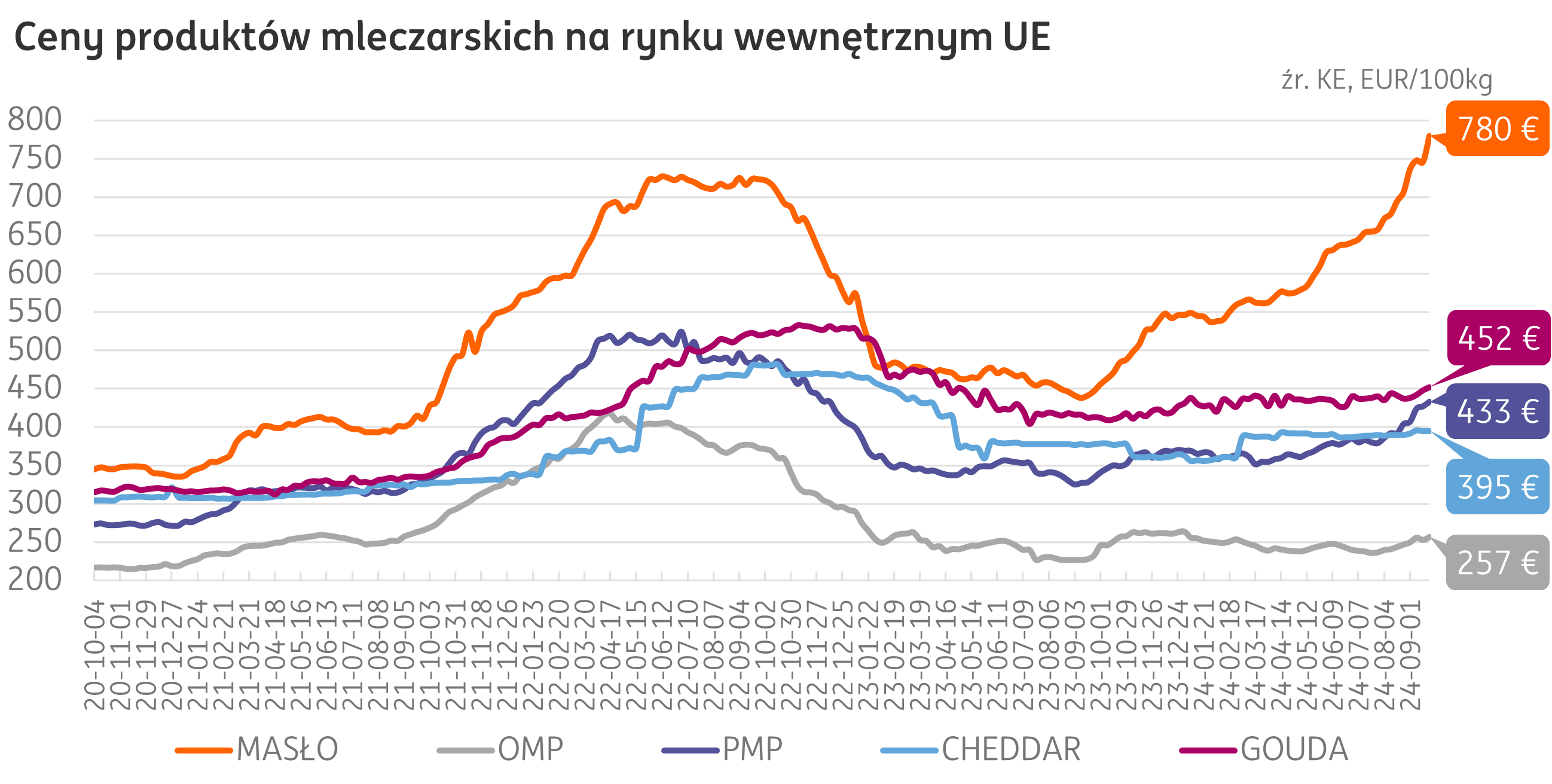 22 września 2024 r. ceny produktów mleczarskich na rynku wewnętrznym UE kształtowały się na następujących poziomach: masło 780 EUR/100 kg (+10% m/m; +74% r/r), OMP 257 EUR/100 kg (+4% m/; +10% r/r), PMP 433 EUR/100 kg (+7% m/m; +30% r/r), ser cheddar 395 EUR/100 kg (+1% m/m; +4% r/r), ser gouda 452 EUR/100 kg (+3% m/m; +10% r/r), serwatka w proszku 95 EUR/100 kg (+13% m/m; +35% r/r).